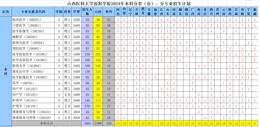 山西医科大学汾阳学院2024年分省市、分专业招生计划