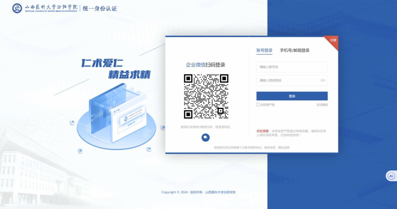 1、从学校官网找到“融合服务门户”进行登录系统,可使用企业微信扫描页面二维码进行登录,或使用账号密码登录;账号为学工号,默认密码为身份证件号后六位。