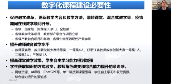 卫涛教授以数智化赋能专业核心课程建设探索与实践”为主题,从生物制药学科发展情况出发,分享了自己在学科建设、虚拟教研室建设、知识图谱建设、课题申报等方面的成功经验和做法,并在教育实践中进行不断创新,讲座过程中还展示了该校在数字化课程建设的诸多成果。