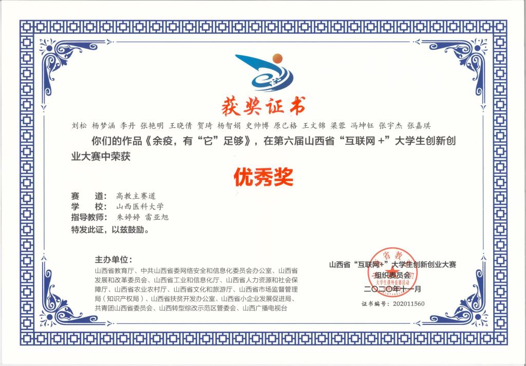 近日,2020年第六届山西省“互联网+”大学生创新创业大赛结果公布,我校作品《余疫、有它足够》在高教主赛道中荣获山西省优秀奖,并在山西医科大学“互联网+”大学生创新创业大赛中荣获二等奖。