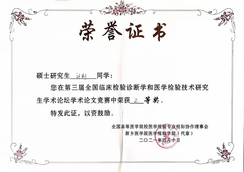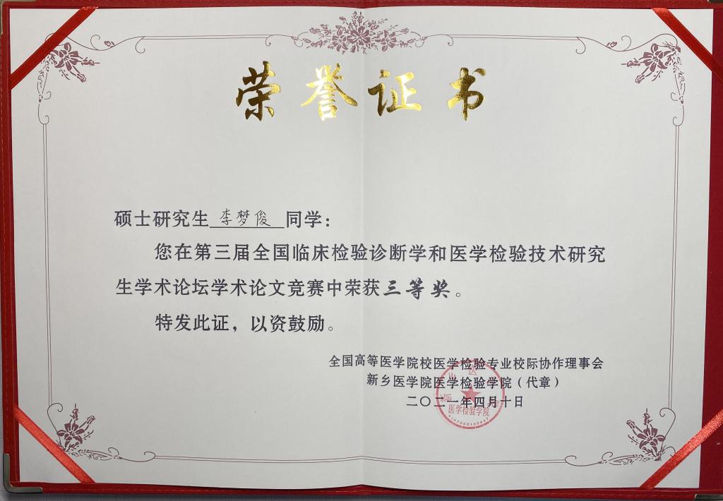 4月9日,第三届全国临床检验诊断学和医学检验技术研究生学术论坛在河南新乡隆重召开。我校临床检验诊断学研究生郝晋芳、刘利、李梦俊代表山西医科大学汾阳学院进行了论文汇报,分别荣获了两个二等奖、一个三等奖的好成绩。