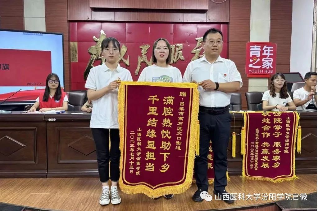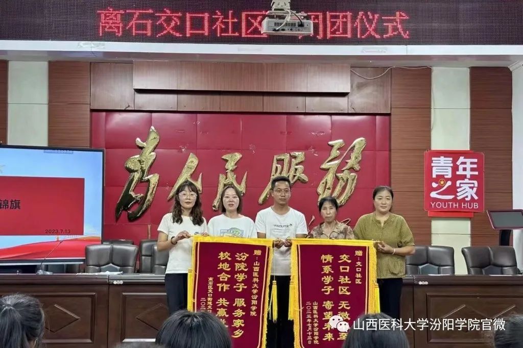 7月13日上午,实践队师生在村委会议室举行了闭团仪式。离石区交口街道主任梁瑞兵、交口社区团委书记付永胜分别进行讲话,指导老师董婧妍进行了总结发言。学校和街道社区互赠锦旗,领导和老师们还为同学们颁发了荣誉证书。为加强校地合作,学校为社区颁发了“大学生社会实践基地”的牌匾。