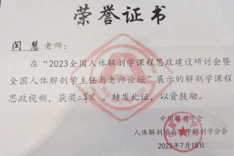 我校基础医学部教师闫慧在全国人体解剖学课程思政示范教学视频评比中荣获二等奖