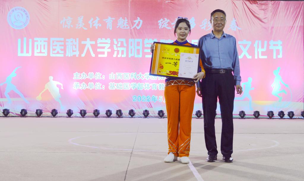 体育运动委员会副主任、基础医学部主任乔海兵为健美操一等奖获得者颁奖