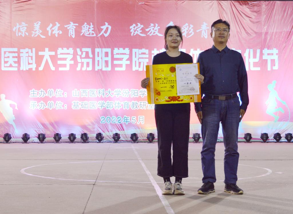 学生工作部(处)部(处)长李荣江、护理学系党总支书记武小丽为花样跳绳计数赛男女组第一名获得者颁奖