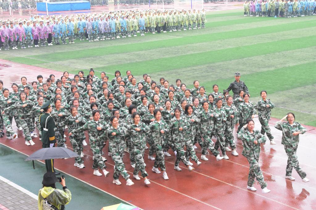随后,2021级全体新生进行了军训汇报表演。同学们冒着细密的秋雨、迈着整齐的步伐、喊着嘹亮的口号,精神抖擞地走过主席台。方队代表进行了男女生队列、拳术、女子匕首操和战术等精彩表演。同学们精神饱满、斗志昂扬,展现了2021级新生朝气蓬勃、积极向上的精神风貌,赢得了现场师生的阵阵掌声。