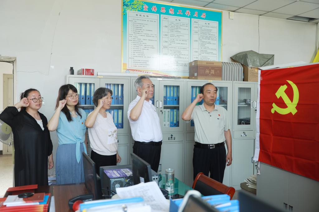 七一”即将来临,为庆祝中国共产党成立100周年,机关党总支第三党支部开展主题党日活动为全体党员过“政治生日”,重温入党誓词,不忘初心使命,激发昂扬斗志。党委书记薛东平以普通党员身份参加了活动,入党积极分子也参加了活动。
