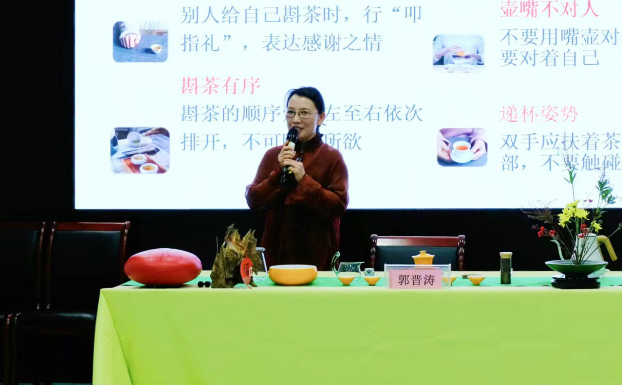 茶文化作为中华优秀传统文化的重要组成部分,蕴含了深邃的人生哲理、丰富的礼仪规范以及独特的审美情趣,如以茶示礼、以茶养心、以茶倡廉、以茶作诗等,表现形式多样。伴随着悠扬婉转的古琴声,郭老师娓娓道来。从中华茶祖神农氏“得荼”到古代茶文化的兴起,再到现代社会茶的普及;从茶性到茶礼,再到茶德,郭老师带领大家走进茶的世界,充分领略中华茶文化的独特魅力。
