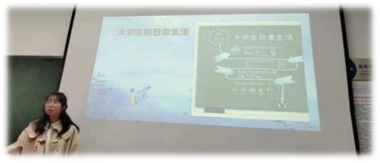 张金花同学宿舍、教室、图书馆、运动四个角度介绍大学生生活。首先是同学们朝夕相处的宿舍,通过一个个动人的小故事讲述舍友之间纯真的友谊;然后是富有书香气息的教室,在教室里不仅能聆听老师们幽默风趣的课程而且老师们的言传身教中收获自身的成长;接下来是典藏云集的图书馆,迈进图书馆就如同走进知识的殿堂,在知识的海洋中自由遨游;最后介绍到同学们在操场上展现风采,去餐厅品尝美食