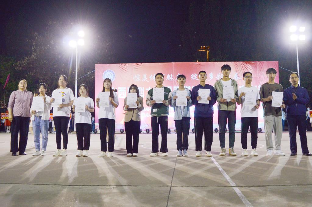 学生工作部(处)部(处)长李荣江、护理学系党总支书记武小丽为花样跳绳计数赛男女组第一名获得者颁奖