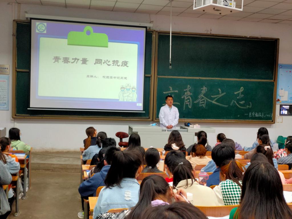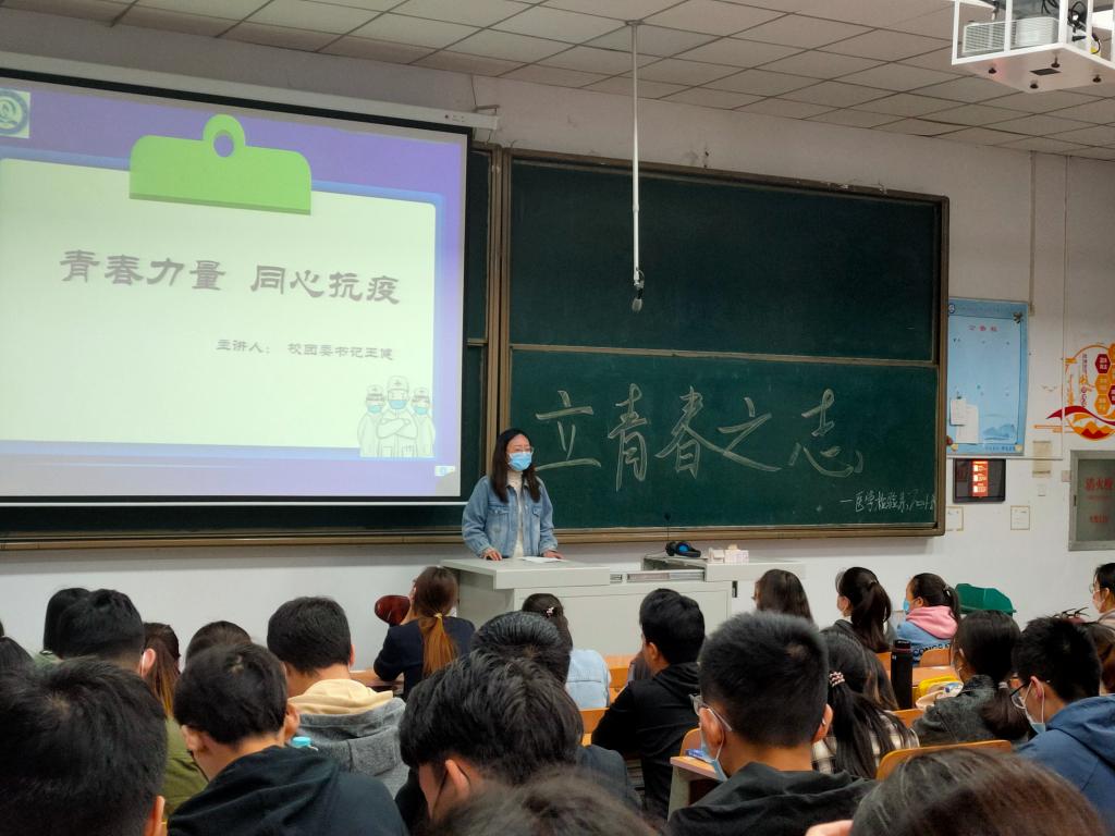为全面培养我校广大青年学生的安全意识,不断增强责任心和使命感,进一步助力我校疫情防控工作的有序推进,4月28日,校团委书记王健深入联系班级医学检验系72001-8班作“青春献力、同心抗疫”主题讲座,讲座由辅导员赵玮主持。