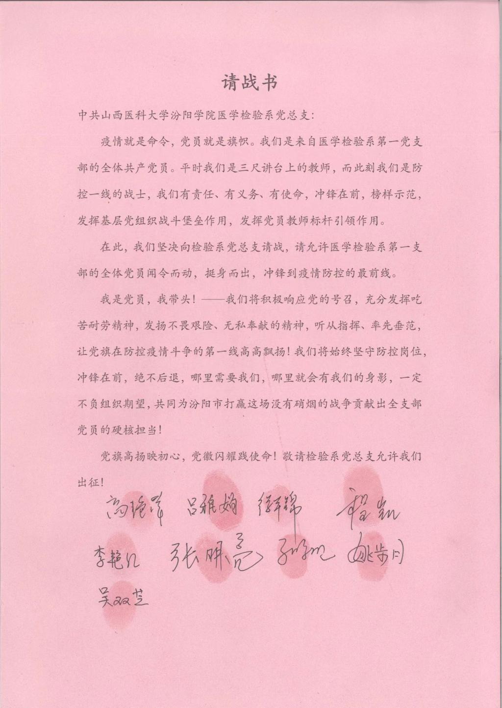 党总支书记李元宏接过请战书,感谢一支部全体党员率先垂范,做出的表率作用,希望一支部全体党员可以带动医学检验系全体教师做到:召之必来,来之必战,战之必胜!将医学检验系打造成一支能战、能胜的队伍。