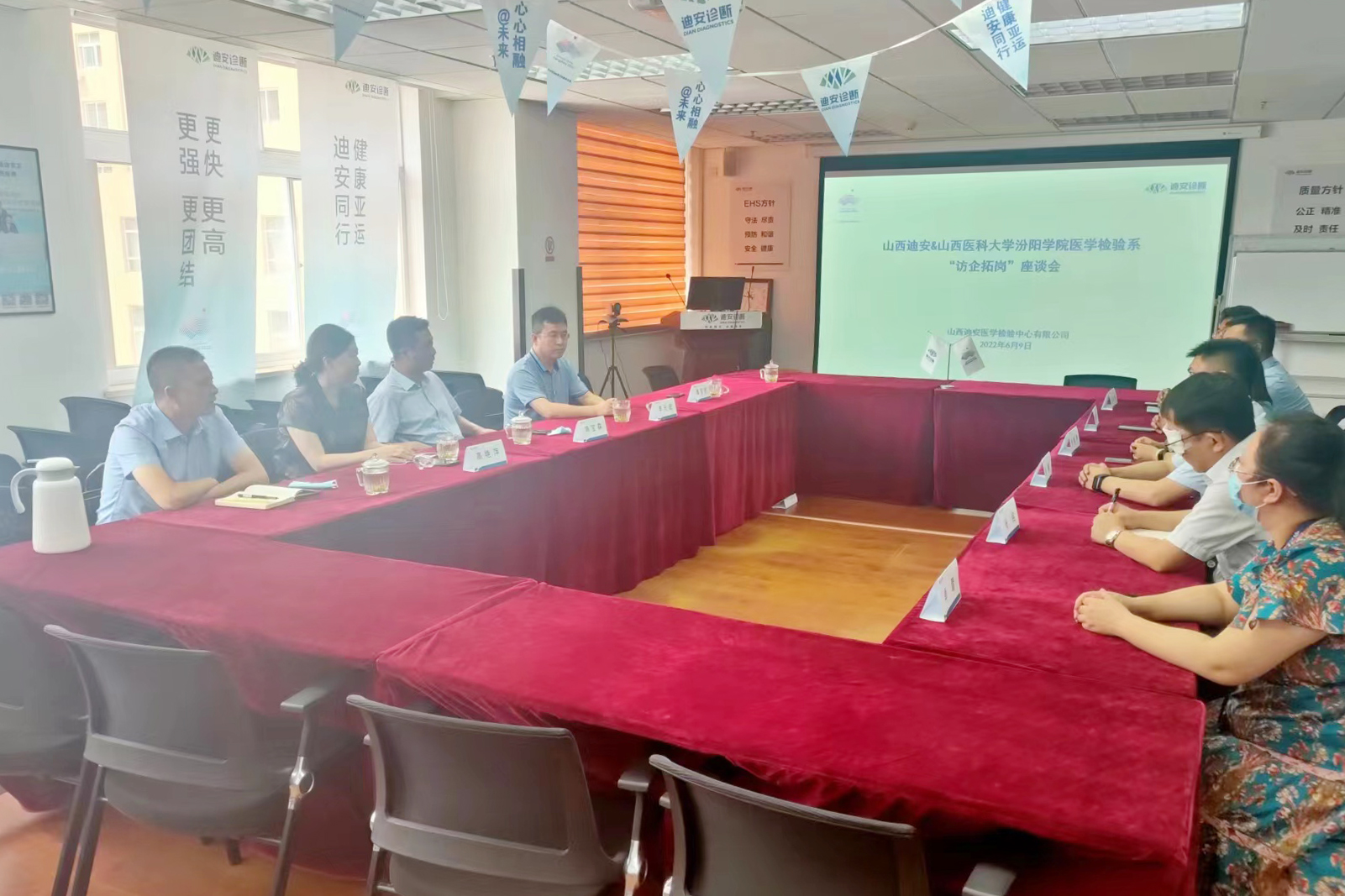 在山西迪安医学检验中心有限公司,公司总经理李曾及人事部门负责人与我校领导座谈。李曾介绍了迪安的发展历史、现状、人才需求及发展规划等情况,对我校实习生、毕业生给予了高度评价。山西迪安医学检验中心有限公司领导表示,2022年将重点考虑择优录用我校部分毕业生。我校党委委员、副院长韩宝森介绍了学校的基本情况及“访企拓岗促就业”专项行动的目的,代表学校感谢相关企业多年对学校办学和就业工作的支持,希望进一步加强校企合作,加强产学研合作,形成协同育人效应,挖掘开发更多的就业机会和岗位。双方深入交换了人才培养合作等方面的意见。