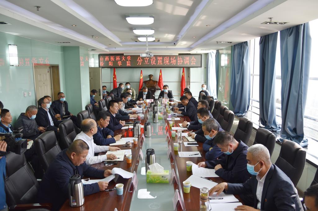 随后,我校党委书记闫敬来在养正楼七层会议室主持召开了分立设置现场协调会,介绍了我校的历史沿革、学科发展、人才培养及未来发展方向。党委副书记、院长孟小平提出了学校在分立设置中需要汾阳市政府帮助解决的土地划拨、政策支持、人才引进、附属医院建设等问题。