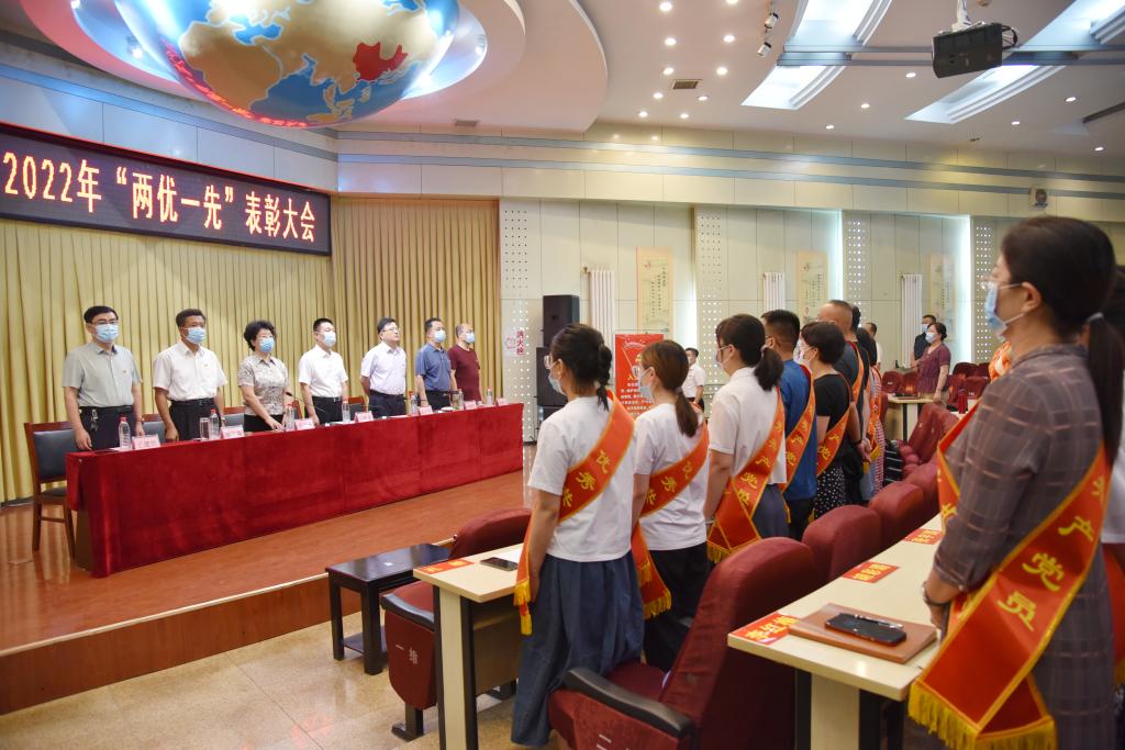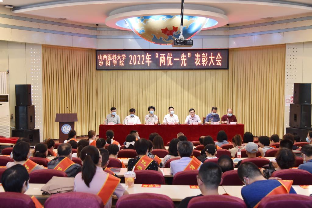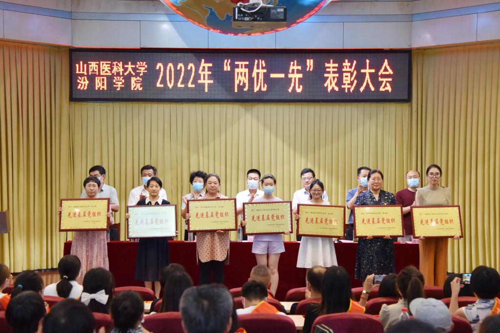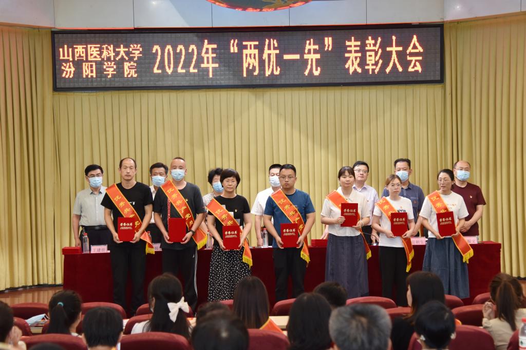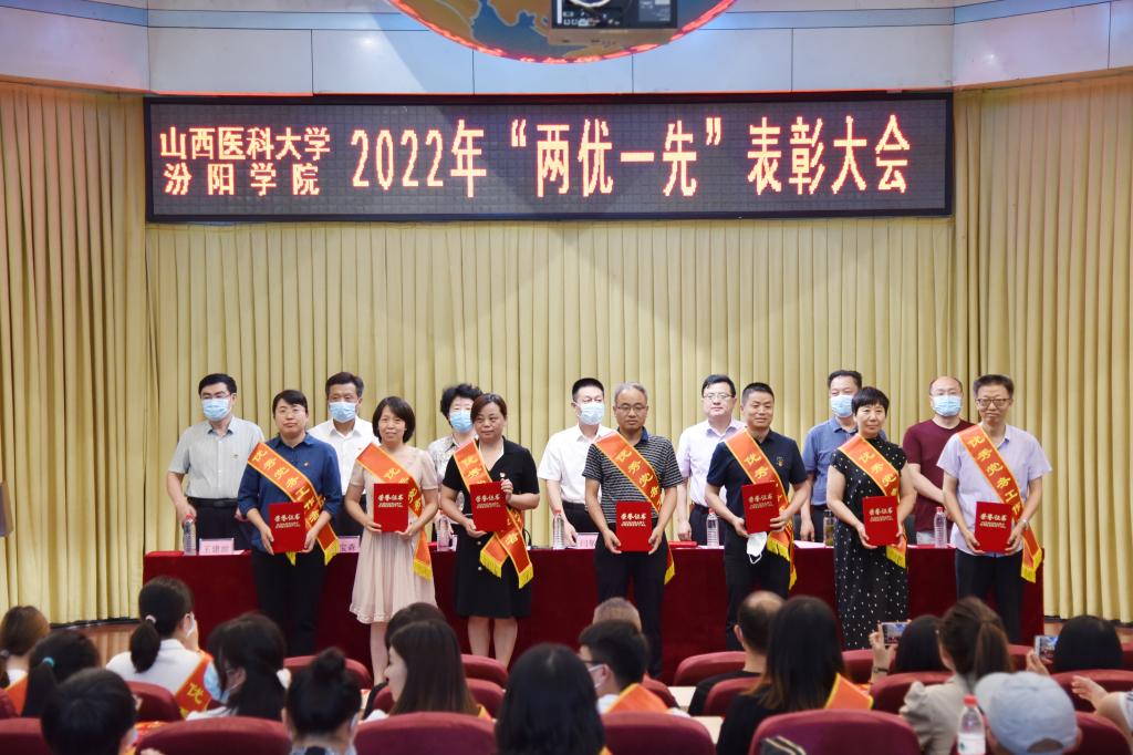 大会在庄严的国歌声中拉开帷幕。党委副书记任云青宣读了《中共山西医科大学汾阳学院委员会关于2022年“两优一先”表彰的决定》。决定授予李锦平等75名同志优秀共产党员称号、胡长茂等20名同志优秀党务工作者称号、机关党总支等14个党组织先进基层党组织称号。校领导为先进集体和优秀个人进行了颁奖。