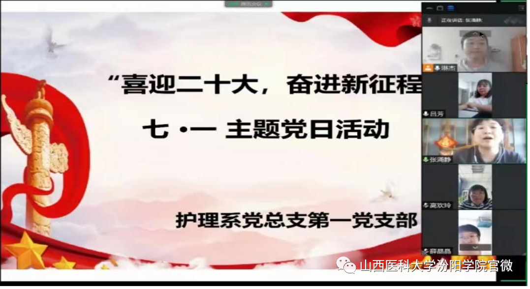 为庆祝中国共产党成立101周年,迎接党的二十大胜利召开,巩固党史学习教育成果,进一步激发党支部活力,增强支部党员的使命感和责任感,7月1日,护理学系党总支第一党支部开展了“喜迎二十大 奋进新征程”庆“七一”主题党日活动。活动通过线上腾讯会议平台进行,支部书记张涌静主持,全体党员参加。