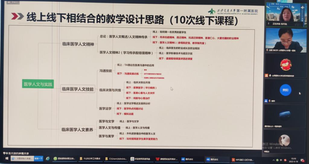 两位专家以课程思政的时代意义开篇,结合自身丰富的课程思政建设与教学实践经验,分别从课程思政教学设计和示范课建设、课程思政案例库建设和运用等方面分享了课程思政建设和实施层面卓有成效的新探索和新实践。张月浪教授以“盐与水”的比喻生动说明如何将思政元素全方位自然融入医学课程的设计、教学和评价中,提出了“定”、“挖”、“筛”、“思”、“成”的课程思政“五部曲”,将价值塑造和医学人文精神、人文技能、人文素养深度融合,培养党和人民信赖的有温度的“五爱”医生,实现立德树人的根本任务。魏琳教授在培训中指出课程建设是课程思政的主战场,国家和社会对医学人才的培养目标是课程思政的建设方向,随后以《医学伦理学》中的课程思政案例库建设为例,解读了医学课程中课程思政建设的核心要求与分层次目标,通过整体规划将案例库中的“思政点”整合为“思政线”和“思政面”,体现出课程思政的广度、深度、温度和热度,进而服务于医学专业课程教学。
