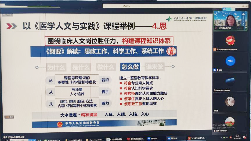 为深入推进学校课程思政建设,落实立德树人根本任务,帮助教师解决课程思政教学及建设过程中存在的困惑,全面提升我校教师的课程思政水平和能力,教师发展中心于6月18日下午组织开展了课程思政系列专题云端培训。教师发展中心主任陈利荣主持了讲座,西安交通大学张月浪教授和魏琳教授受邀担任主讲,我校各系(部)主任、教研室主任、教学秘书、课程负责人以及承担教学任务的专任教师和附属医院教师230余人参加了培训。