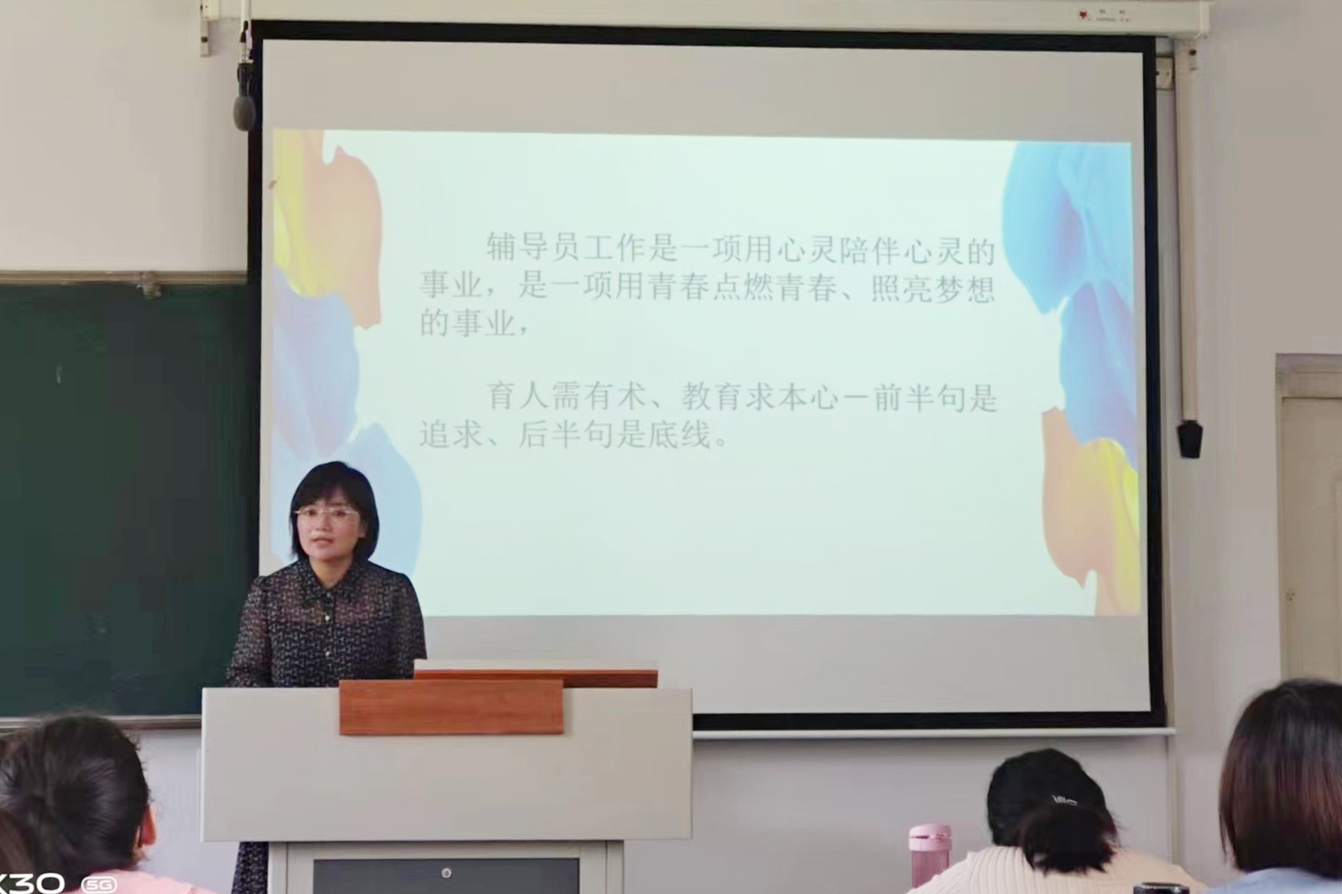 在专题讲座中,八位老师分别从宏观政策、人才培养目标、学生管理、团学活动、党建工作、心理育人、班级活动、辅导员实务八个专题高屋建瓴、深入浅出地进行讲解。武小丽书记以《辅导员+学业导师 助力全方位育人》为题,从辅导员与学业导师协同育人的必要性、二者的角色定位与职责划分,教育引导辅导员和学业导师用自己的人格魅力、学识魅力感染学生,做好新时代学生思想政治教育工作。李红梅主任从专业人才培养角度系统解读了学校《护理学人才培养方案》,强调了护理学系“厚基础、重人文、强技能”的育人特色。赵彦文副书记以《用心与坚持 让平凡的工作出彩》为题,告诫各位辅导员和学业导师要从“心”出发、浇花浇根、育人育心。康智芳老师以《校园文化润心田 春风化雨育青年》为题,从团学角度,重点介绍了“天使”十大系列活动,为做好护理学系共青团工作指明了方向。王娟老师以《夯基固本 铸魂赋能—强化党建引领促发展》为题,从党建角度分享了做好意识形态工作和党建工作的感受。郭志刚老师从心理学角度重点剖析了辅导员心理育人的方法策略。燕国华老师以《引领学生思想 陪伴学生成长》为题,讲述了一个个关于学生、关于爱的生动故事。成永红老师以《笃信笃行 在辅导员岗位上发光发热》为题,全方位讲述了精心准备第一课、系统规划新学期、迈开双脚“四走进”、推动落实谈心制、探索育人新机制的方法案例。