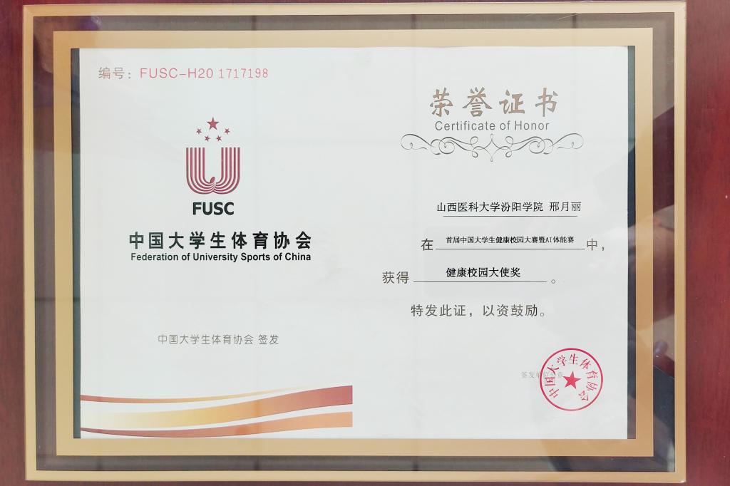 由中国大学生体育协会主办,首届中国大学生健康校园大赛暨AI体能赛于2021年12月13日至2022年6月24日举行。经过综合评比,我校在全国351所参赛高校中获得“中国大学生健康校园大赛暨AI体能赛健康校园二等奖”,基础医学部体育教研室副主任邢月丽老师获得“健康校园大使奖”, 基础医学部体育教研室副主任雷秀红和教师陈文汉、王尧鸣、门杰、袁超获得“中国大学生健康校园优秀教师”奖,参赛学生蔡永铭、张小艳分别获得男子、女子第一名,其他10名学生分别进入前六名。