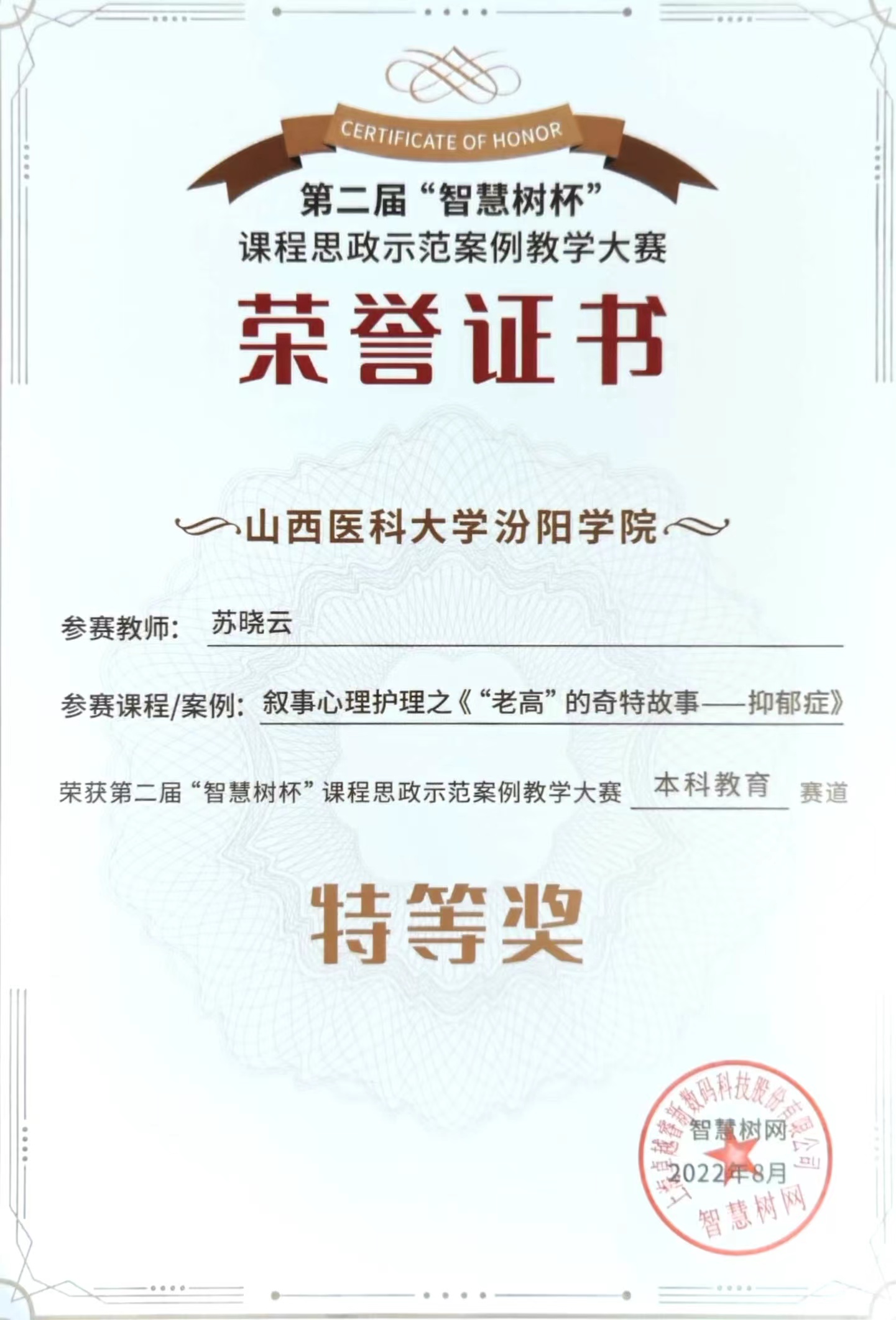 本次大赛面向全国高校专业课程,挖掘、展示在线课程及混合式课程的课程思政教学设计及建设成果。大赛分为普通本科教育及高等职业教育两个赛道,初赛和复赛两个阶段进行,共有全国500余所学校的2000余份课程思政案例材料参与竞赛。我校护理学系苏晓云老师参赛的课程为《精神科护理学》。经过激烈的角逐,层层选拔,最终获得普通本科教育赛道特等奖,并受聘为“智慧树高等教育研究”课程思政专家,为我校赢得了荣誉。