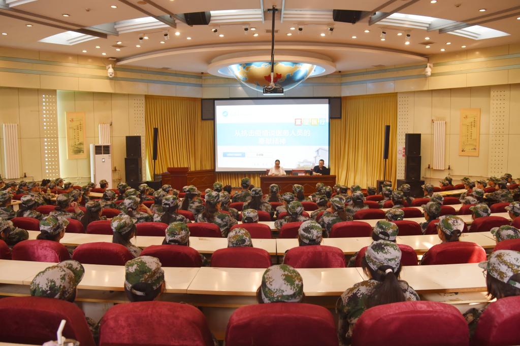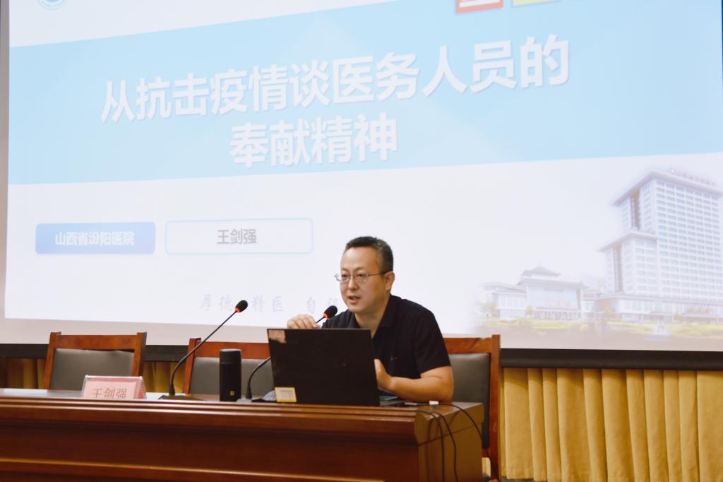 我校特邀汾阳医院重症医学科副主任、汾阳医院援沪医疗队队长王剑强在敦学楼学术报告厅讲授“大思政课”讲座。学生工作部部长常明亮,汾阳医院医学教育科主任张中平、医学教育科副主任陈亮,汾阳医院临床护理教研室副主任王秋红及相关负责人,2023级新生代表200余人参加,学生工作部王莉梅老师主持了讲座。王剑强老师以《从抗击疫情谈医务人员的奉献精神》为题分享了援沪经历和个人体会。他指出,在过去三年的疫情中,医务人员坚持人民至上、生命至上,白衣执甲、勇担使命,成为最美“逆行者”,在科研、临床、防控一线顽强拼搏、日夜奋战,筑牢一道道“防火墙”,撑起一把把“保护伞”,护佑着14亿人民的生命安全和身体健康,为打赢疫情防控阻击战作出了不可替代的贡献。他感谢同学们选择了医学这个崇高的职业,希望同学们涵养“敬佑生命、救死扶伤、甘于奉献、大爱无疆”的医疗职业精神,不忘医者初心,牢记健康使命,永葆一颗敬畏之心、感恩之心,不断学习先进的医学理念,提高医疗服务水平,为建设健康中国、增进人民健康福祉贡献青春力量。