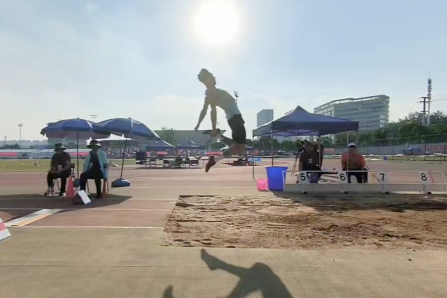 武文杰同学参加第21届全国大学生田径锦标赛男子甲组跳远现场