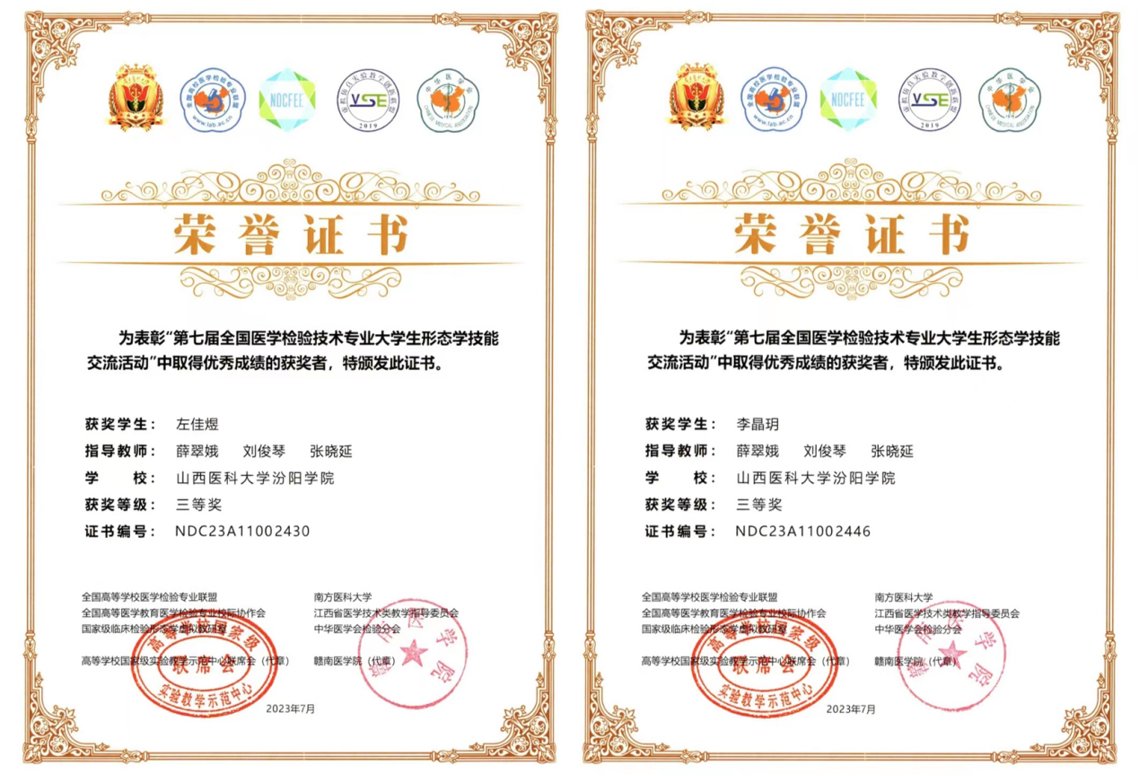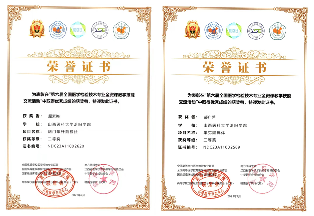 7月14日至7月17日,由高等学校国家级实验教学示范中心联席会、全国高等医学教育医学检验专业校际协作会、全国高等学校医学检验技术专业联盟等单位主办,中华医学会检验分会协办的2023年全国医学检验信息化发展论坛暨信息化成果展示交流会在江西赣州举行。我校医学检验系原素梅老师、郝广萍老师分别在金微课比赛中获得二等奖、三等奖,薛翠娥老师、刘俊琴老师和张晓延老师指导的720班李晶玥同学和s722班左佳煜同学分别获得形态学大赛本科组三等奖,为我校争得了荣誉。