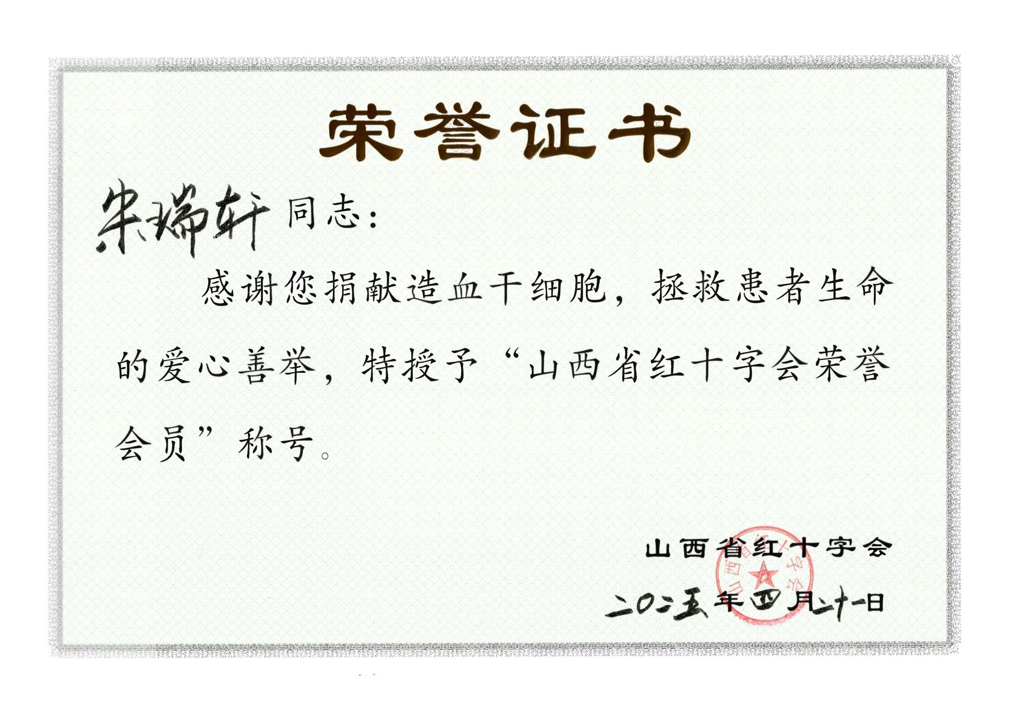 因缘际会,仅仅一年多后朱瑞轩同学就遇到了需要他的人。2025年1月17日,国家管理中心通知山西省管理中心,朱瑞轩同学HLA分型资料与一名16岁的血液病患儿配型吻合。当红十字会工作人员询问朱瑞轩“是否愿意捐献造血干细胞”时,朱瑞轩同学面对突如其来的匹配通知,毫不犹豫同意捐献。在非血缘关系人群中,这种配型的成功率只有十万分之一甚至百万分之一。1月24日,朱瑞轩同学在运城红十字会的协助下采集10ml血样进行高分辨检测;2月25日,体检顺利通过。起初,朱瑞轩同学的母亲担心会伤害朱瑞轩的身体,但是在朱瑞轩同学给她科普造血干细胞捐献相关知识、强调这件事的重大意义后,她选择了支持儿子,做儿子坚实的后盾。