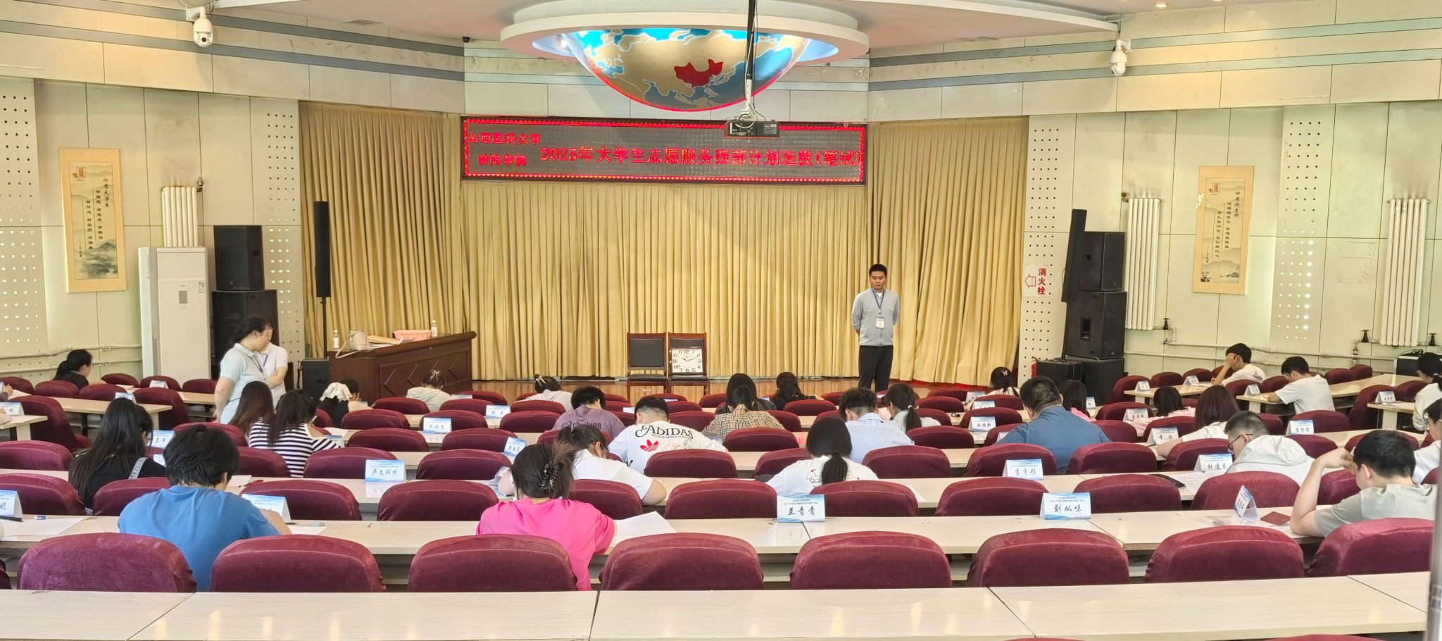 考试按照山西省项目办的要求和标准进行。笔试命题紧扣西部计划政策、时政热点以及党团基础知识等内容,全面考查同学们的理论知识储备、政治素养与道德修养等综合能力。面试采用“自我介绍+提问答辩”的标准化流程,从实践经历、服务意愿、心理测评等多个维度进行综合评估。考试现场秩序井然,监考人员和评委老师严格履职,确保考试公平公正。