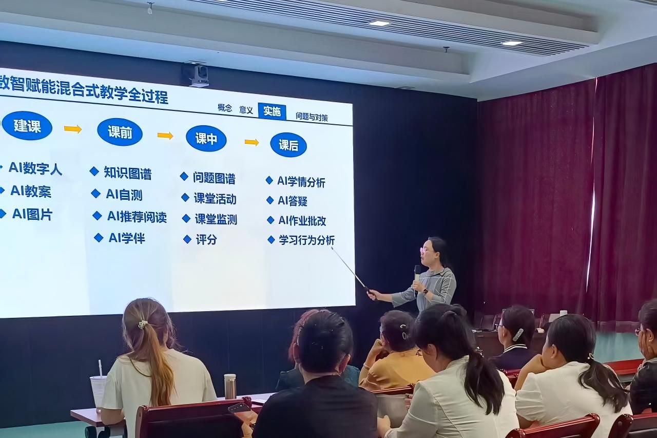 讲座中,徐洁教授围绕“数智背景下混合式教学的核心概念、实践意义、实施路径及问题对策”四大核心维度,展开系统且深入地阐述。她以《麻醉设备学》课程教学实践为案例,深度拆解“数智技术赋能教学全流程”的操作细节。依托人工智能(AI)、知识图谱等技术优化课前、课中、课后各环节。课前通过AI学情分析生成精准教案、推送AI自测内容,课中借助AI数字人辅助教学、开展互动课堂活动并进行实时课堂监测,课后利用AI作业批改、AI学伴答疑及学习行为分析提供个性化指导,同时结合问题图谱梳理知识重点,通过AI推荐阅读拓展学习边界。徐洁教授特别强调,数智技术的应用不仅能精准匹配师生教学需求、提升学生学习成效,更可推动思政元素与课程教学内容有机融合,最终助力教育领域数字化与智能化深度转型。