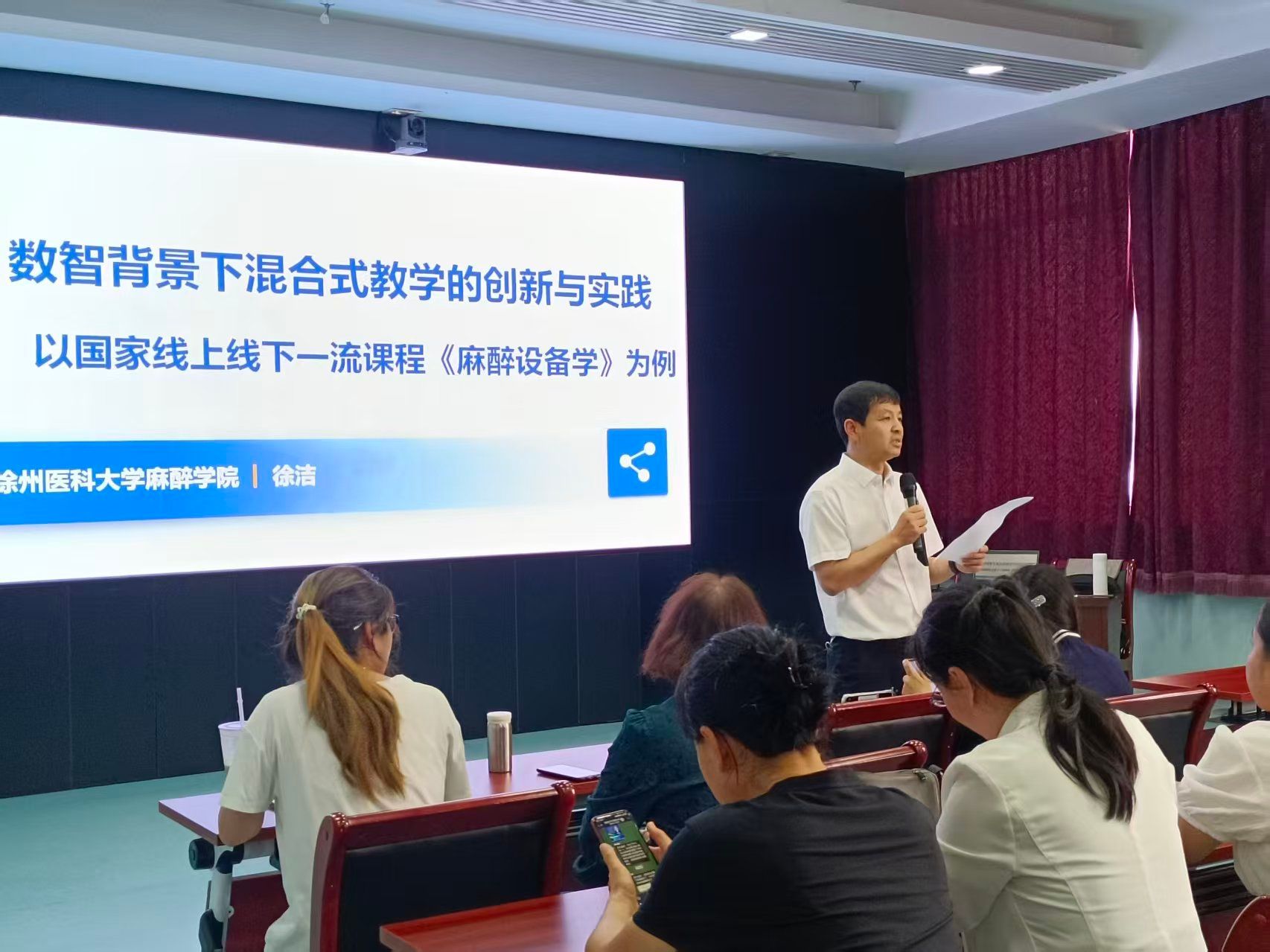 为深入推进教育数字化转型,切实提升我校教师数智化教学能力与实践水平,9月12日下午,我校教师发展中心联合临床医学系特邀徐州医科大学麻醉学院徐洁教授,以国家级线上线下一流课程《麻醉设备学》为实践样本,开展“数智背景下混合式教学的创新与实践”专题讲座。教师发展中心副主任陈利荣主持,校内80余名教师听取讲座。