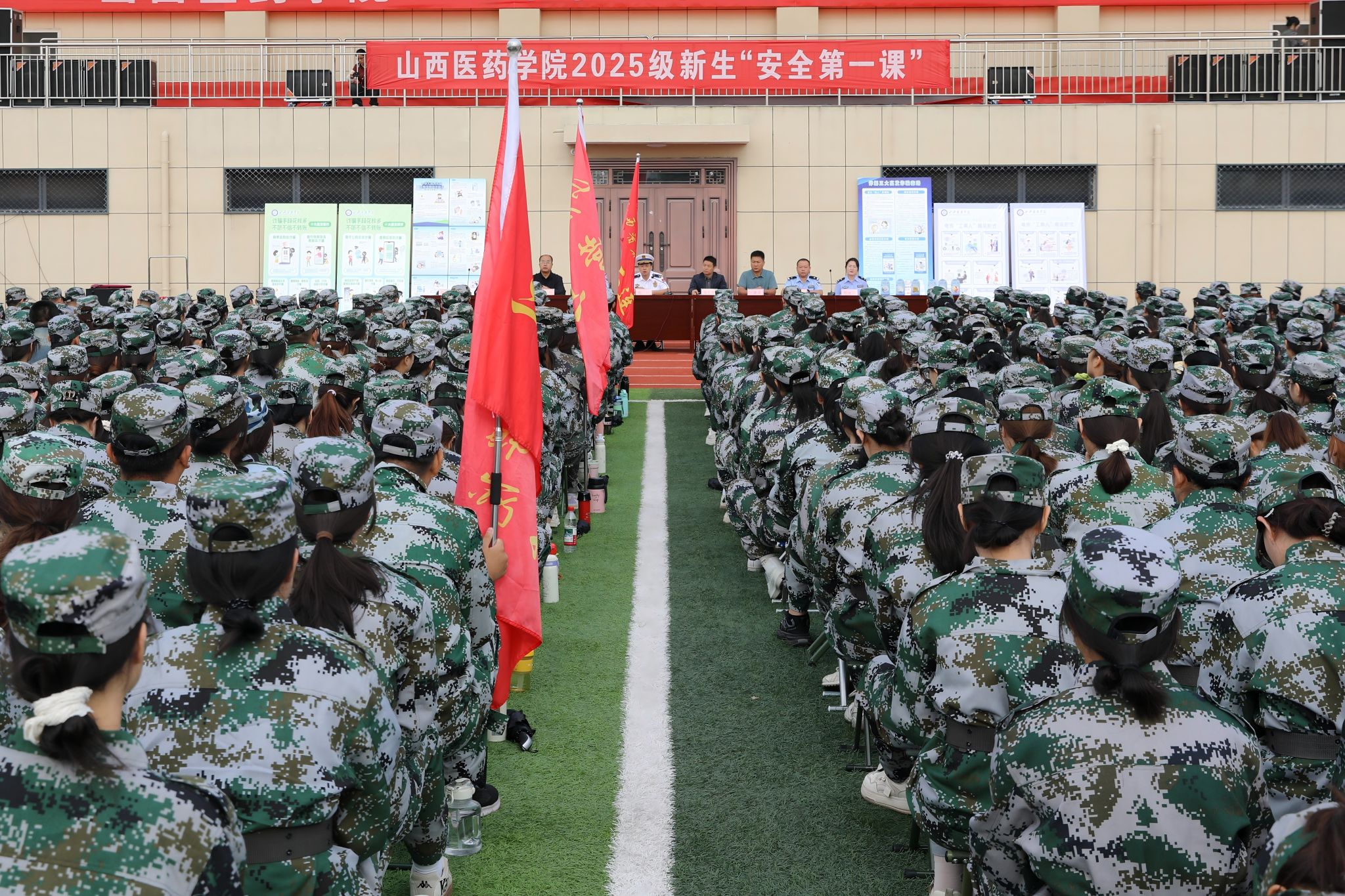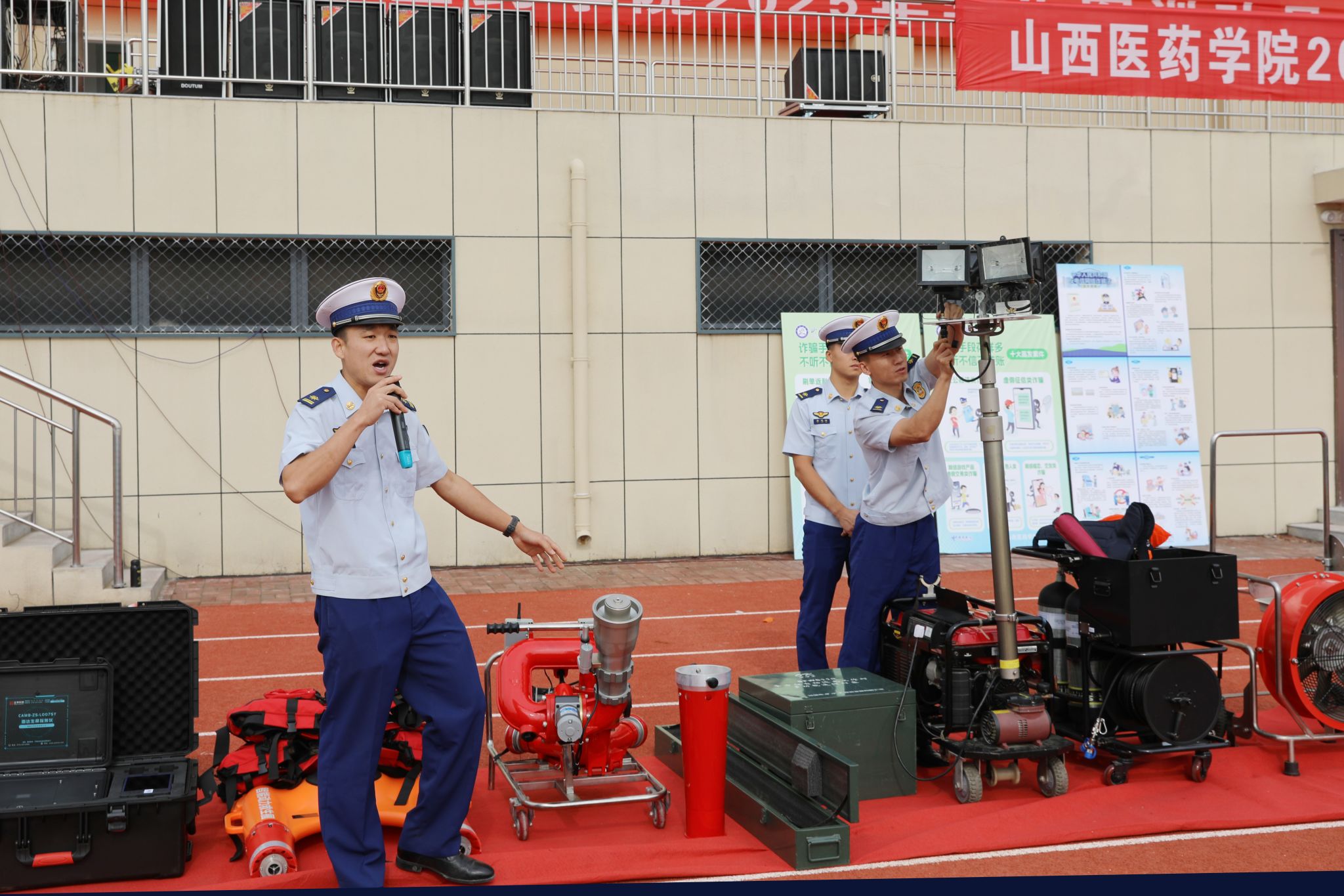 为深入贯彻落实总体国家安全观,扎实推进平安校园建设,提升学生安全意识和应急自救能力,9月18日至19日,我校举行2025级新生“安全第一课”暨应急演练活动。活动由校保卫处、孝管办牵头组织,校宣传部、学生处、团委等相关部门配合,特邀汾阳市、孝义市公安、消防、交警、禁毒、金融等多部门专家进校园开展宣传教育活动。校保卫处处长梁勇刚主持。
