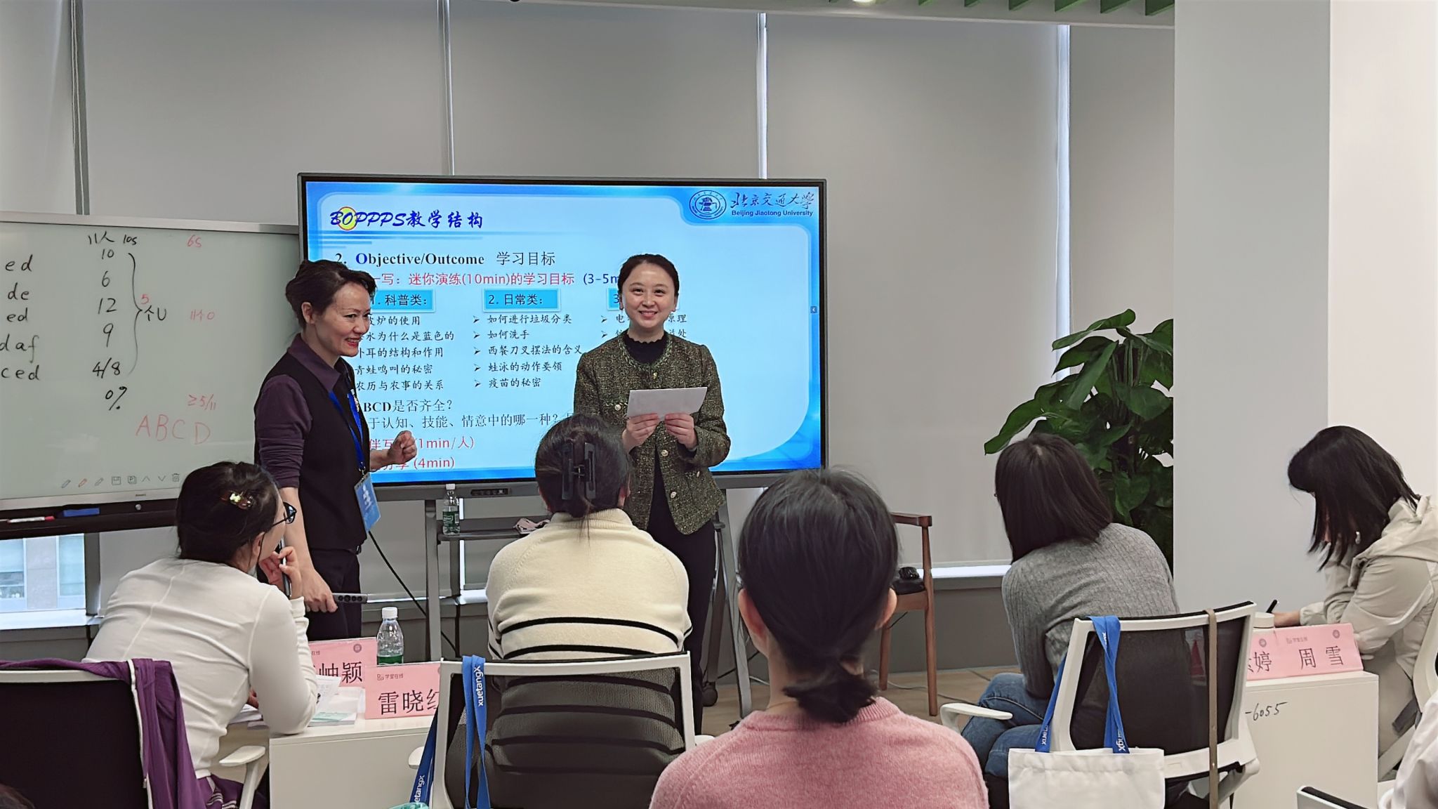 ISW教学技能工作坊是国际公认的实效性教学培训项目,以其高度结构化、参与式和反馈模式著称。本次ISW工作坊由北京交通大学黄辉、刘亚蕾和刘彪三位获得FDW国际认证的教师教学发展师担任培训师和引导员。工作坊以 BOPPPS 有效教学模式为核心理念,以合作学习小组为单位,开展互助式、研讨式的集中研修,通过系列主题课程和三轮迷你教学演练循环使学员逐步加深对教育教学理论的深度理解以及教学技能、策略的灵活运用,极大地提升了老师们的教学自信和教学反思能力。