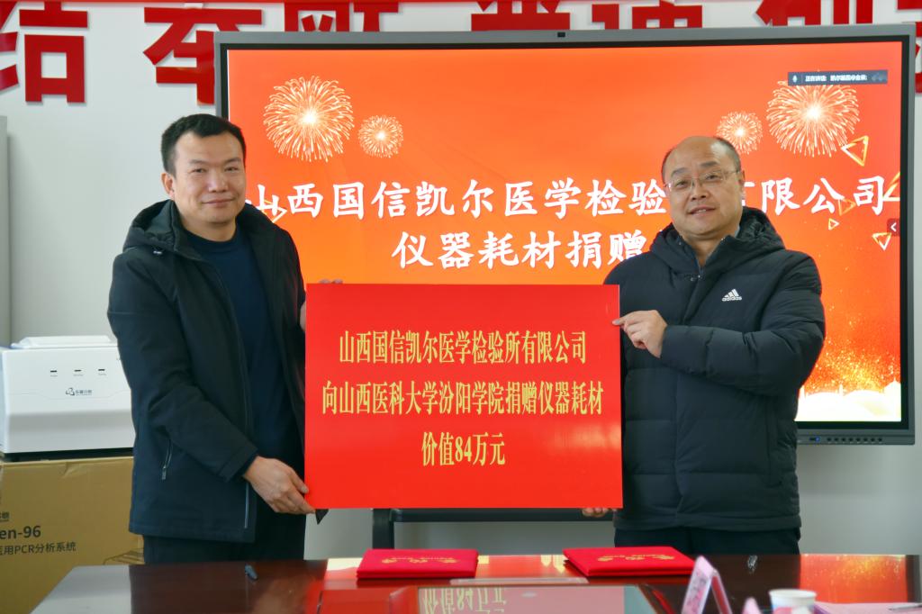 1月9日上午,山西国信凯尔医学检验所有限公司向我校捐赠仪器耗材仪式在医学检验系会议室隆重举行。校党委委员、副院长陈振文,科技中心主任吴惠文,医学检验系主任张晓延,教务处副处长王艳锋,计财处副处长赵秀彬,山西国信凯尔医学检验所有限公司董事长王万恒先生(线上)、常务副总经理金豪、副总经理尹祥(医学检验系97届校友)、市场部经理卢嫄一行出席了捐赠仪式。捐赠仪式由医学检验系主任张晓延主持。