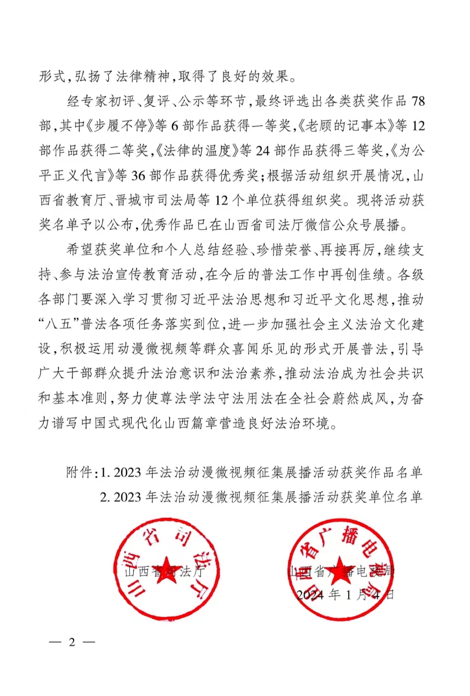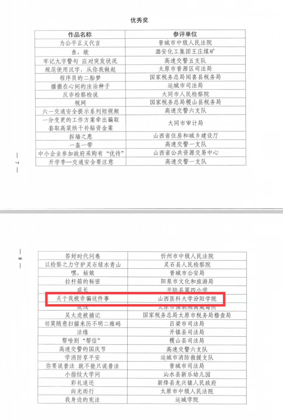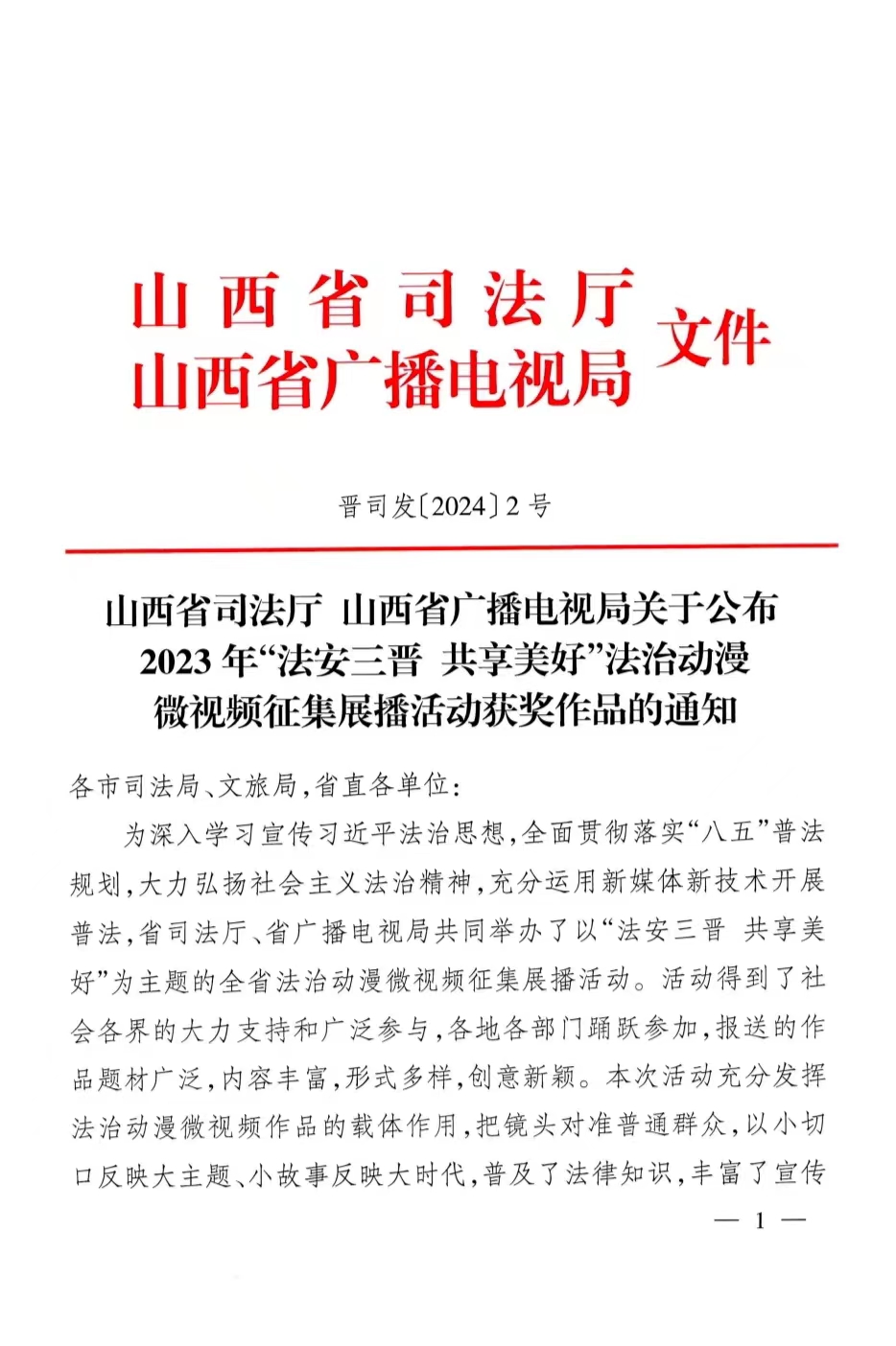 此次比赛面向省直各事业单位,各地市司法局、文旅局,经专家初评、复评、公示等环节,最终评选出各类获奖作品78部,获奖作品在山西省司法厅微信公众号进行了展播。