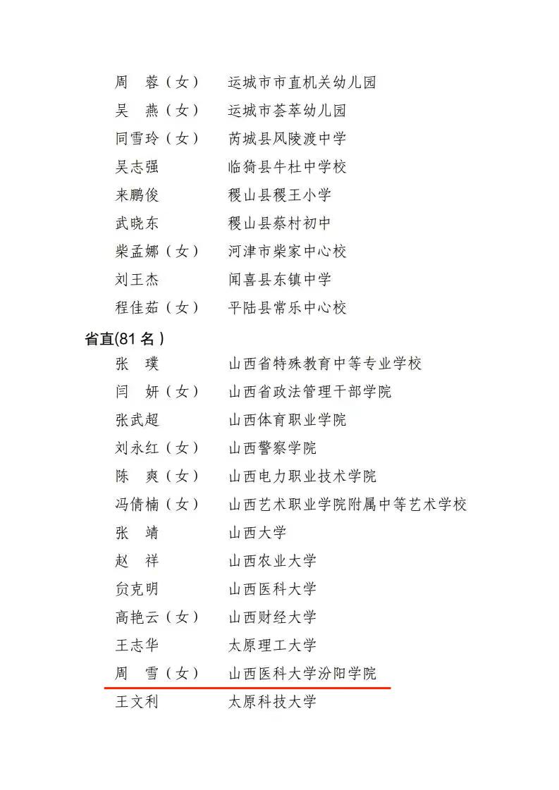 近日,省人力资源和社会保障厅、省教育厅公布了山西省教育系统先进集体、模范教师和先进工作者表彰名单,我校护理学系教师周雪荣获“山西省教育系统模范教师”荣誉称号。