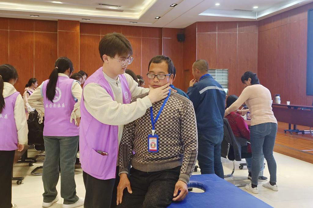 同学们对学员们进行了“一对一”或“一对二”的帮助。课堂上,帮助学员理解课程知识,辅助教师讲解穴位和手法,担当教学模特,协助教师讲好实践课程;课堂外,帮助学员做好签到、上下楼梯、就餐等。