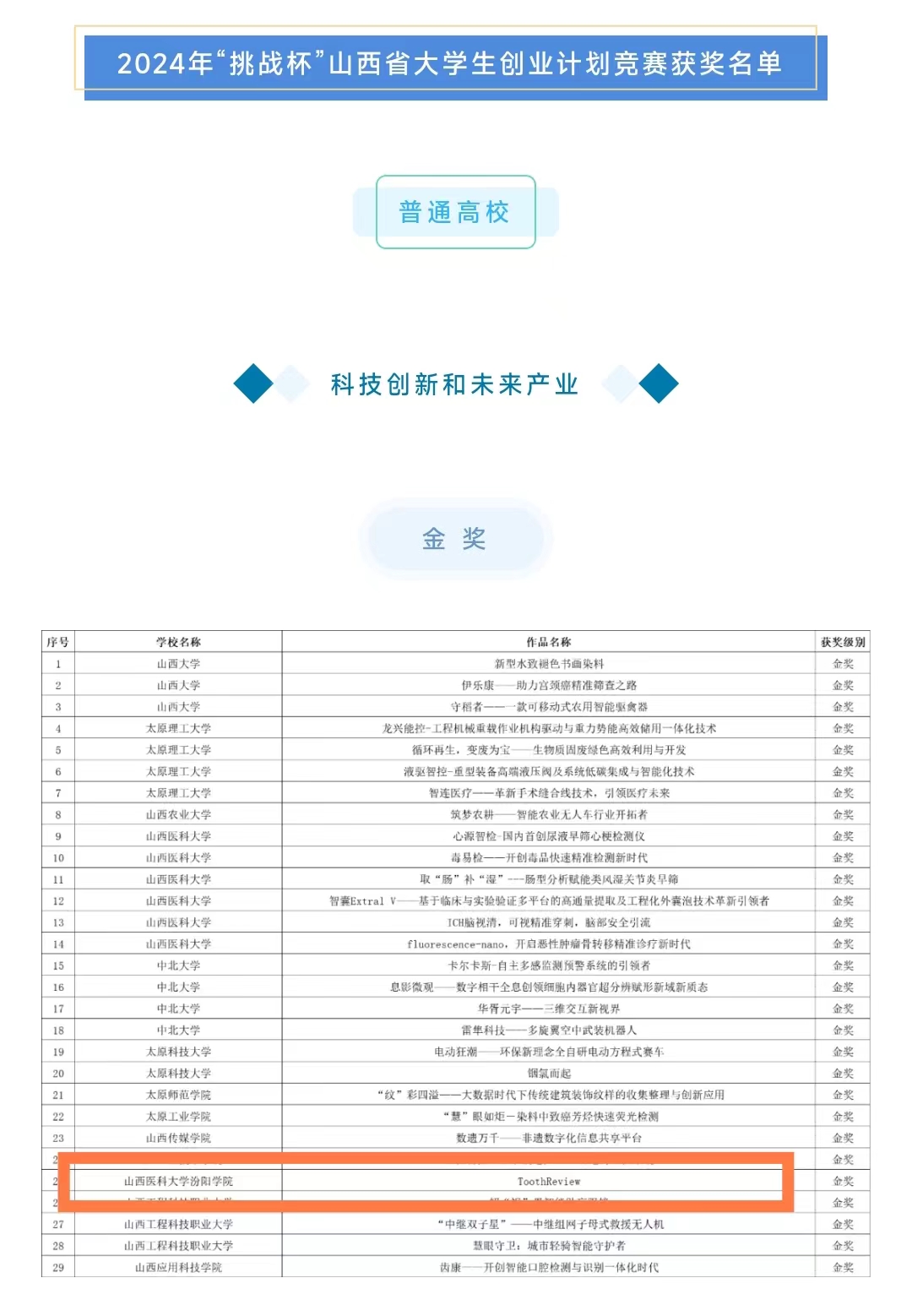 5月30日,由团省委、省教育厅、省科协、省社科院、省学联共同主办的第十四届“挑战杯”山西省大学生创业计划竞赛决赛在中北大学举办。我校精心选送的20件作品揽获金奖1项、银奖1项、铜奖15项,创历史最佳成绩。
