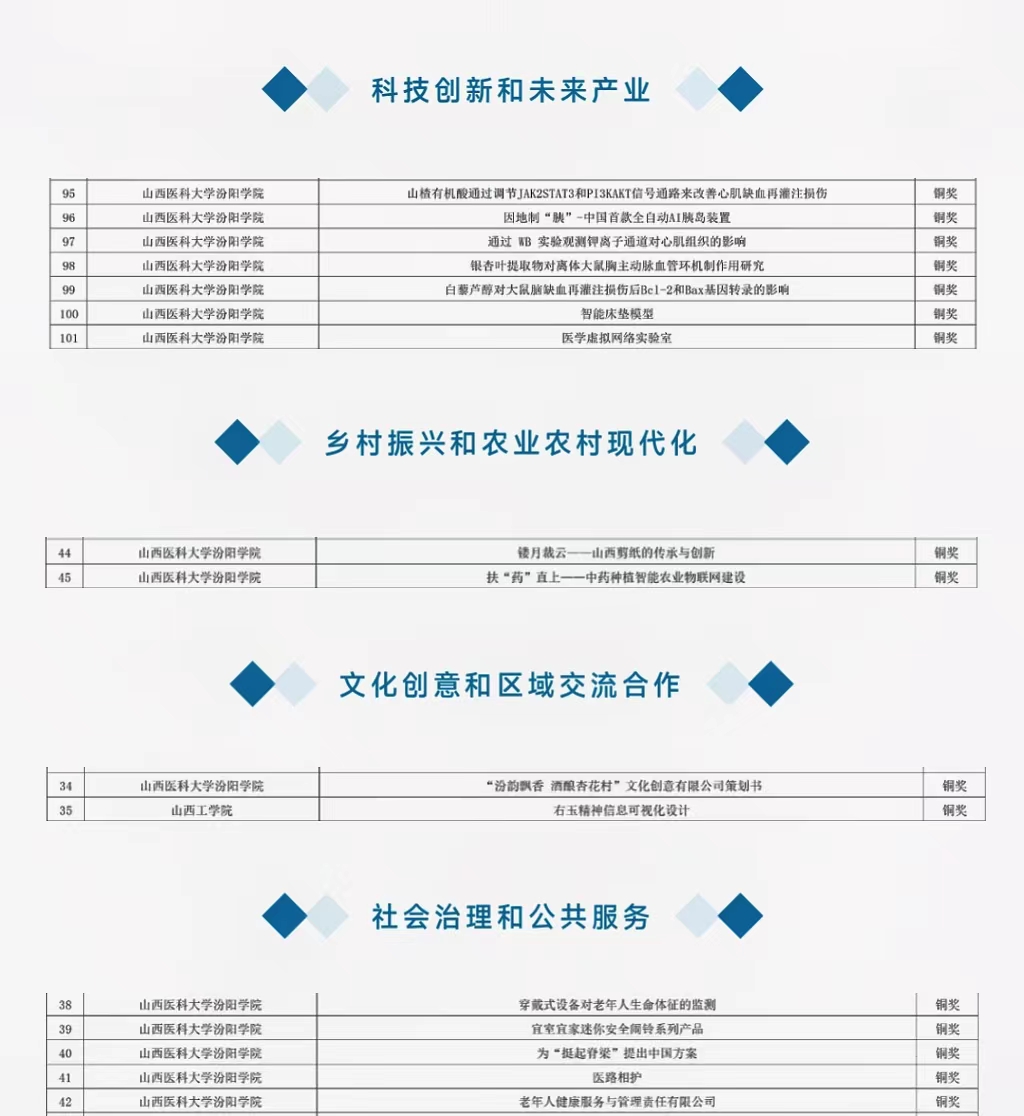 本次大赛涵盖科技创新和未来产业、乡村振兴和农业农村现代化、文化创意和区域交流合作、社会治理和公共服务4个组别,共吸引全省53所高校、8万余名师生,9000余件作品参赛,是山西省内影响力最大、覆盖面最广、含金量最高的大学生创新创业竞赛活动之一。