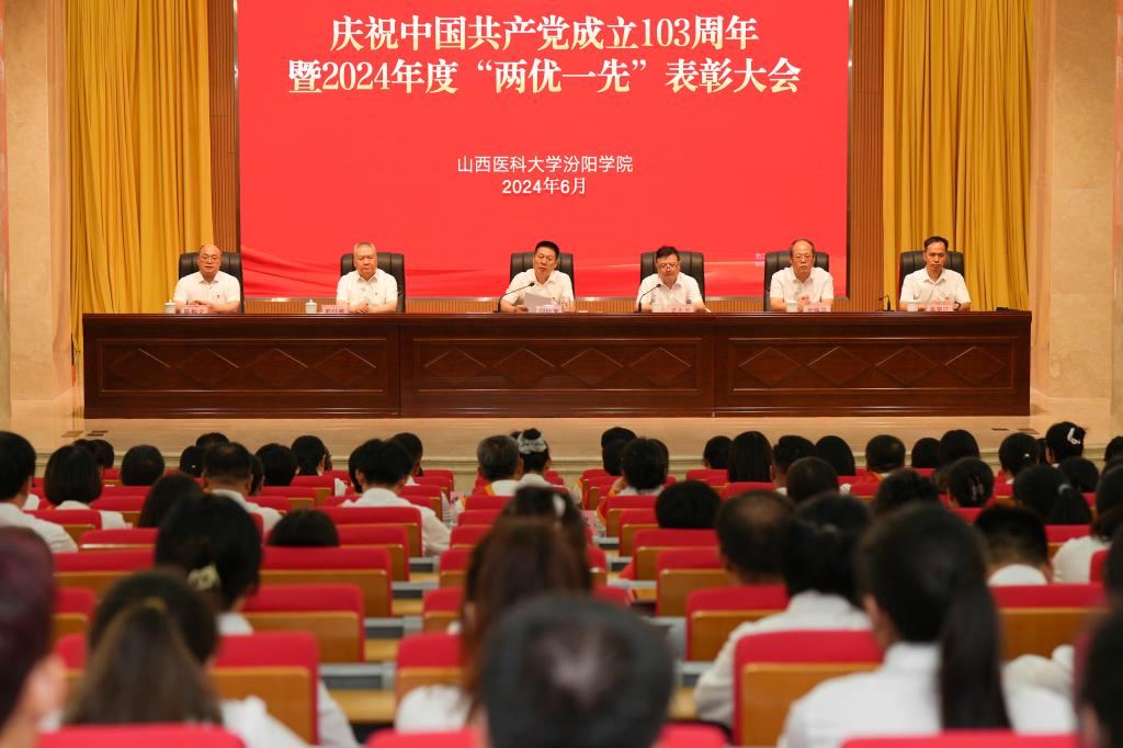 为庆祝中国共产党成立103周年,扎实推进党纪学习教育,6月28日下午,我校召开庆祝中国共产党成立103周年暨2024年度“两优一先”表彰大会。全体在校校领导、汾阳医院党委书记郭任维、学校中层副处级以上干部、受表彰的集体和个人参加了会议。会议由党委副书记、院长孟小平主持。