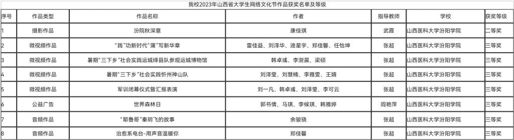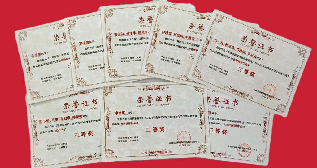 近日,山西省教育厅主办的2023年全省大学生网络文化节及高校网络教育优秀作品征集展示活动圆满落幕,评选结果正式揭晓。我校在本次活动中共有8个作品获奖,其中二等奖1项,三等奖7项。