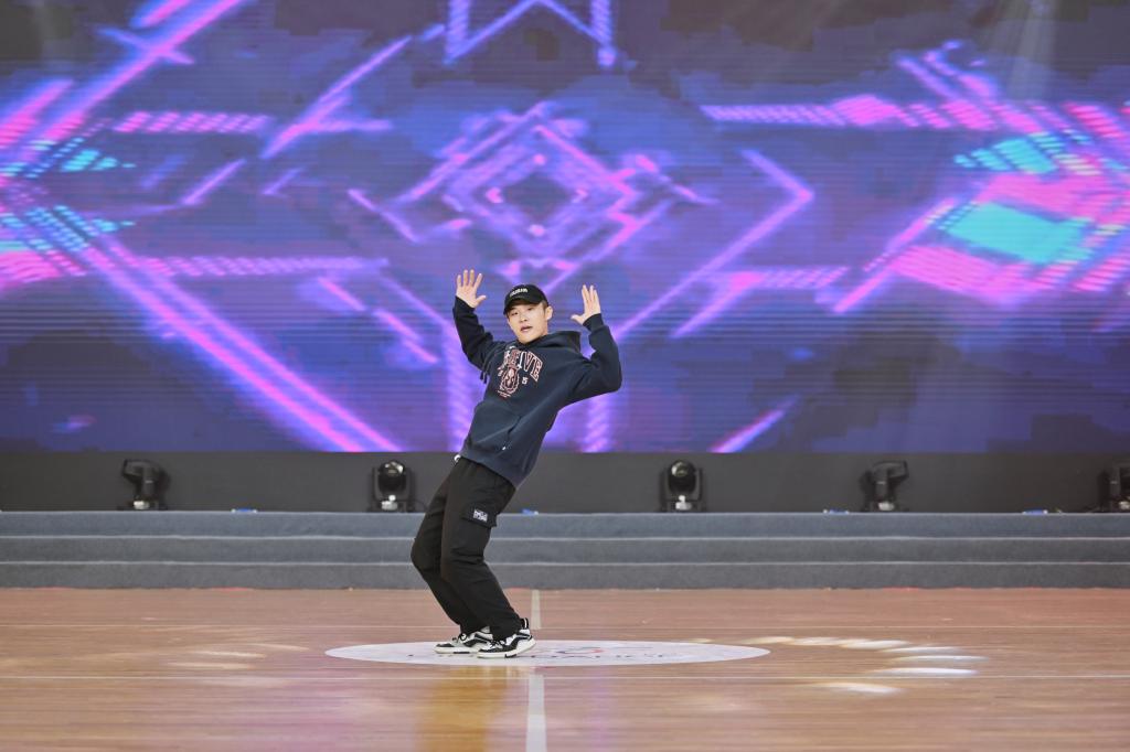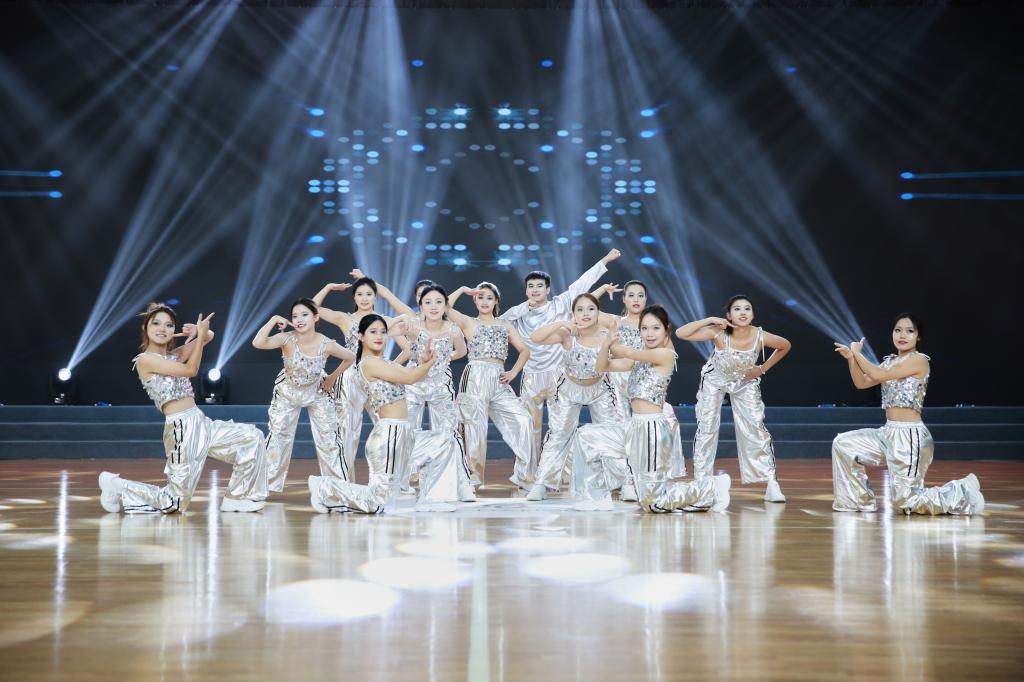 我校获普通高等学校组乙组混合组大集体街舞类自选项目特等奖的表演现场