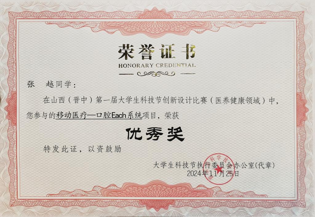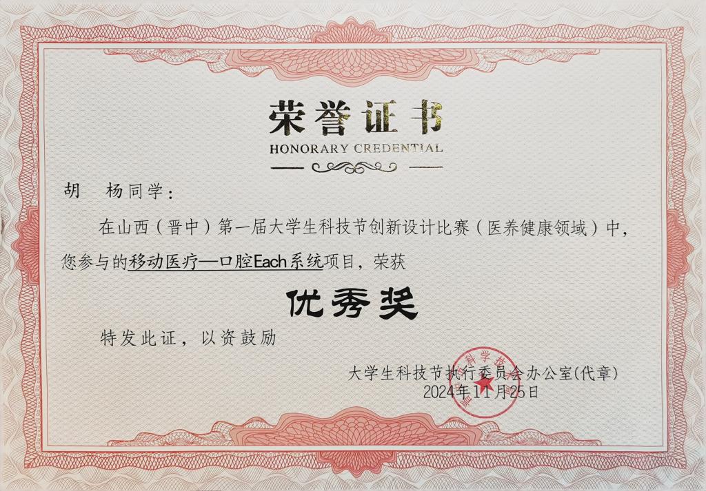 11月6日,由山西省科学技术厅、山西省教育厅指导,中共晋中市委、晋中市人民政府共同主办的“山西省科技活动周·山西(晋中)第一届大学生科技节创新设计比赛”在山西工程职业科技大学举行。我校临床医学系口腔医学教研室教师蔡岫颖、鞠华龙指导的口腔医学专业921班胡杨、922班杨之越和922班张越三位同学,凭借项目“移动医疗-口腔Each系统”的出色表现,荣获比赛优秀奖。