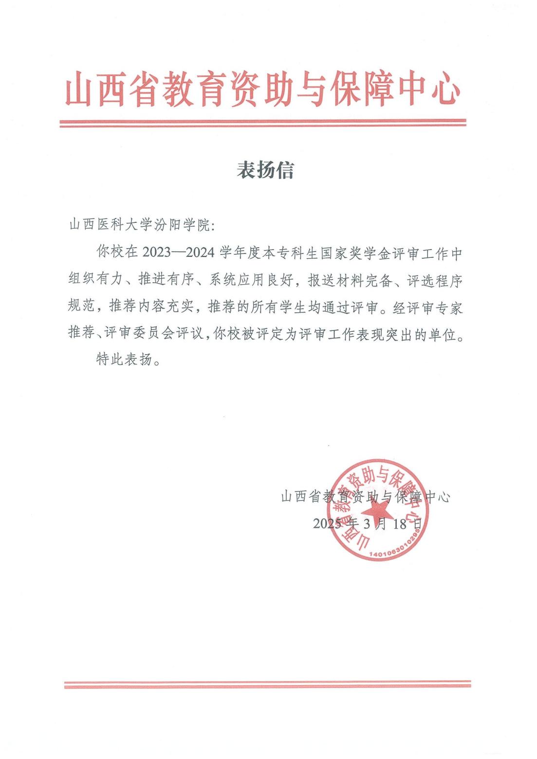 近日,我校收到山西省教育资助与保障中心发来的表扬信。信中指出,我校在2023-2024学年度国家奖学金评审工作中组织有力、推进有序、系统应用良好,报送材料完备、评选程序规范、推荐内容充实,推荐的所有学生均通过评审。我校被评定为评审工作表现突出单位。