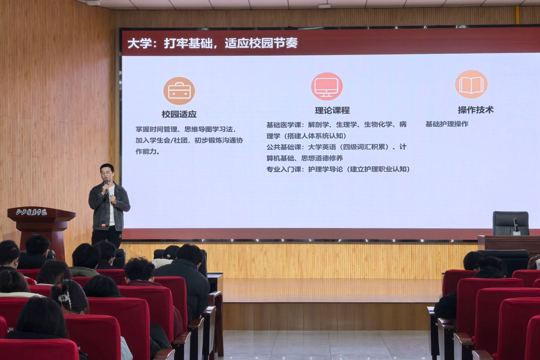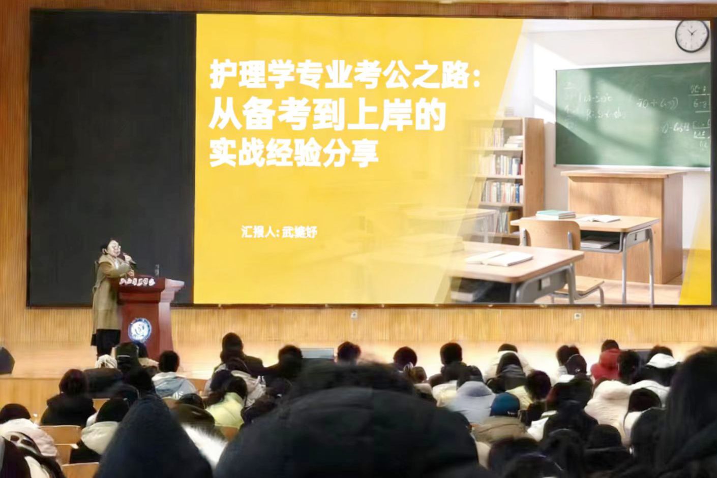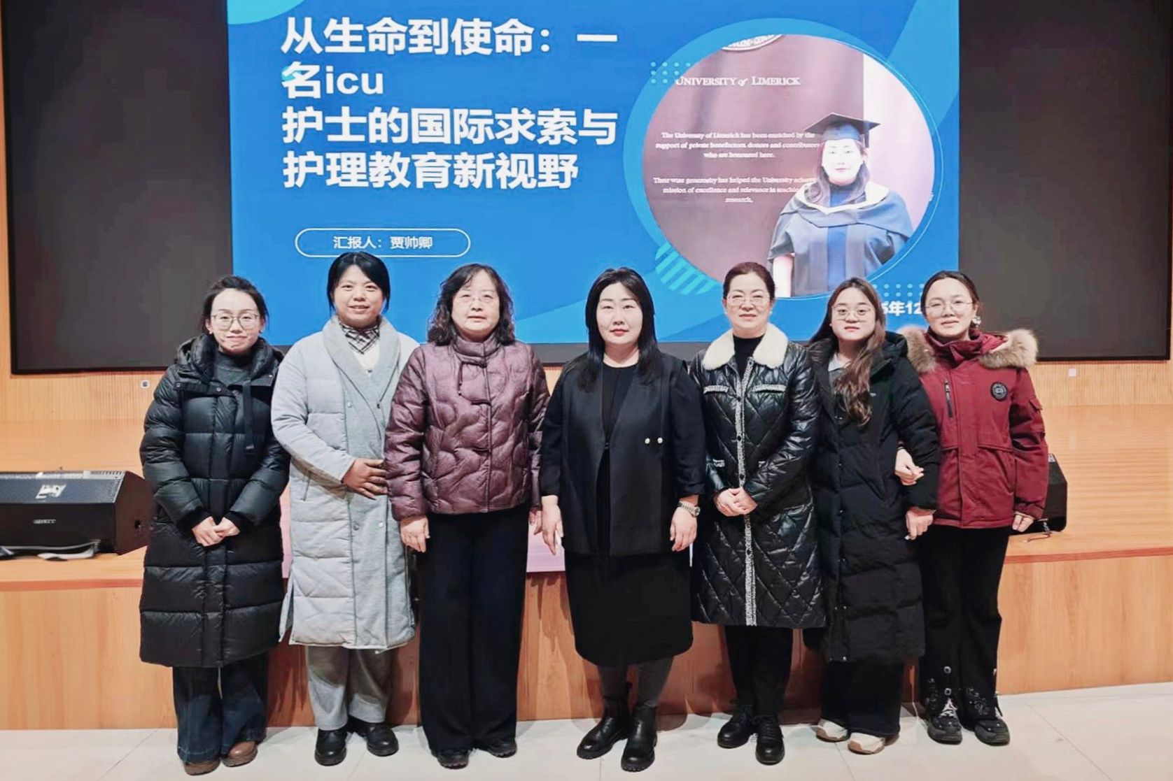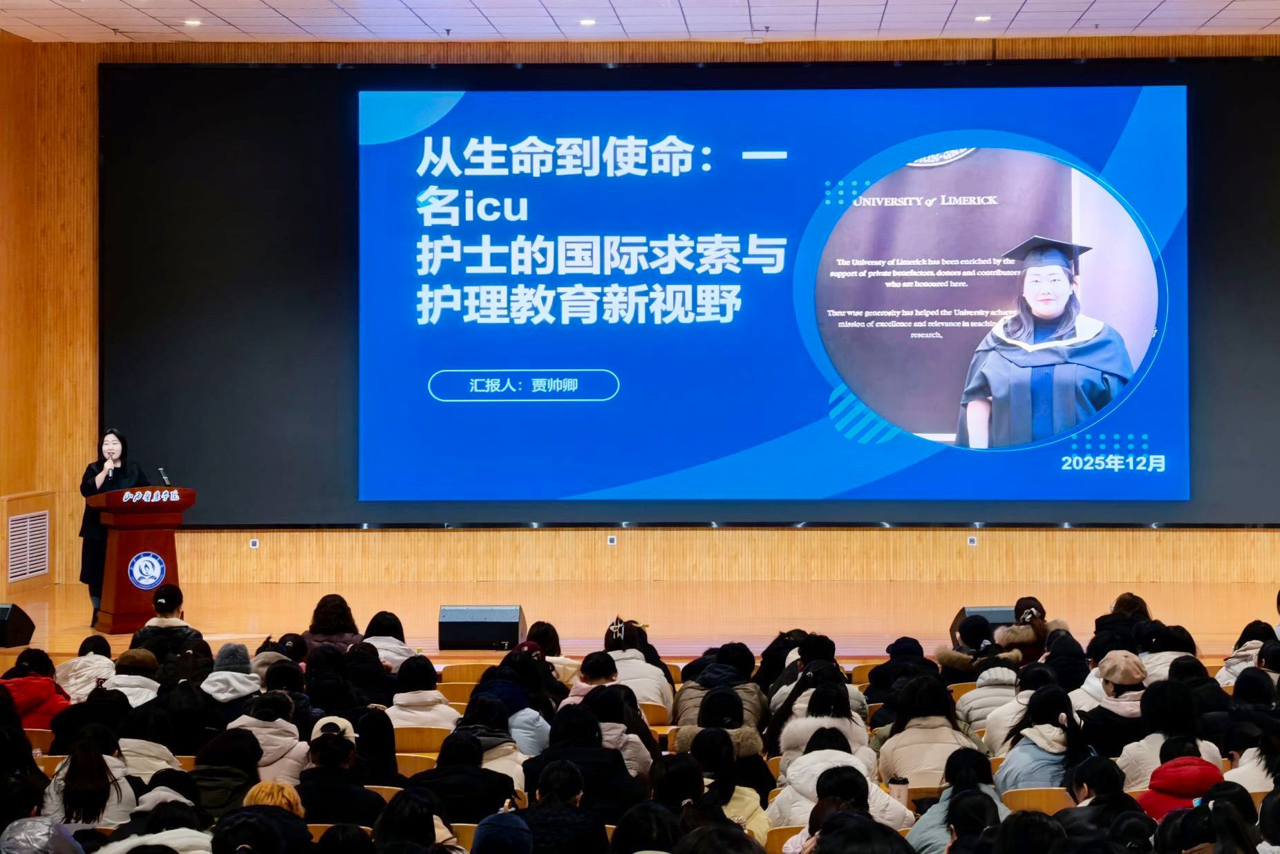 12月26日,2012届校友、我校附属第一医院、山西省汾阳医院重症医学科(ICU)护士贾帅卿以“国际视野,人文铸魂”为主题作讲座。贾帅卿曾在中国飞往爱尔兰的航班上挺身而出,凭借专业素养和冷静处置,成功救治一名晕厥患者,被中国文明网、山西新闻联播等媒体报道。她立足自身深厚的临床实践,融合海外学习的独到见闻,系统分享了护理国际化发展的前沿趋势、国际护理教育的特色模式,并深刻阐述了护理人文关怀的核心要义与践行之道,生动传递了护理职业应有的温度、深度与使命感,引领新生拓宽国际视野,坚定专业信念,厚植职业情怀。