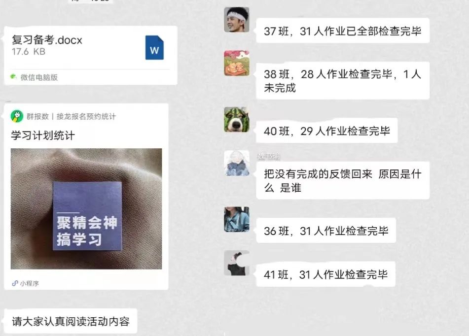 本次活动分为制定学习计划、实施学习计划、检查学习成果、检查结果与反馈四个部分。同学们以个人或组队的形式参与活动,经过统筹思考作出对自己、对班级负责的学习规划,有效促进班内同学间的互帮互助。有了学习规划,可以大幅度地提高同学们的自主学习能力,以“云自习室”这种全新的方式进行学习,是一种挑战也是一个机遇。同学们自由安排时间进行打卡学习,突破了固有死板的学习模式,也有效改善了同学们在家散漫无章的生活态度,云自习打卡学习这种方式看似没有人监督实际上却处处有痕迹可查的,着实为当下疫情在家学习中的有力帮手。