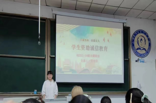 为以学增智、以知促行,有效提升大学生的自觉素养与行为,培养学生树立诚信观念,珍惜个人信用,增强法律意识和契约精神。62211-19班在5月21日晚七点,于聚成楼三教开展了有关“学生资助诚信教育”的主题班会。本次班会由组织委员梁淑芸同学主持,全体同学都参与其中。