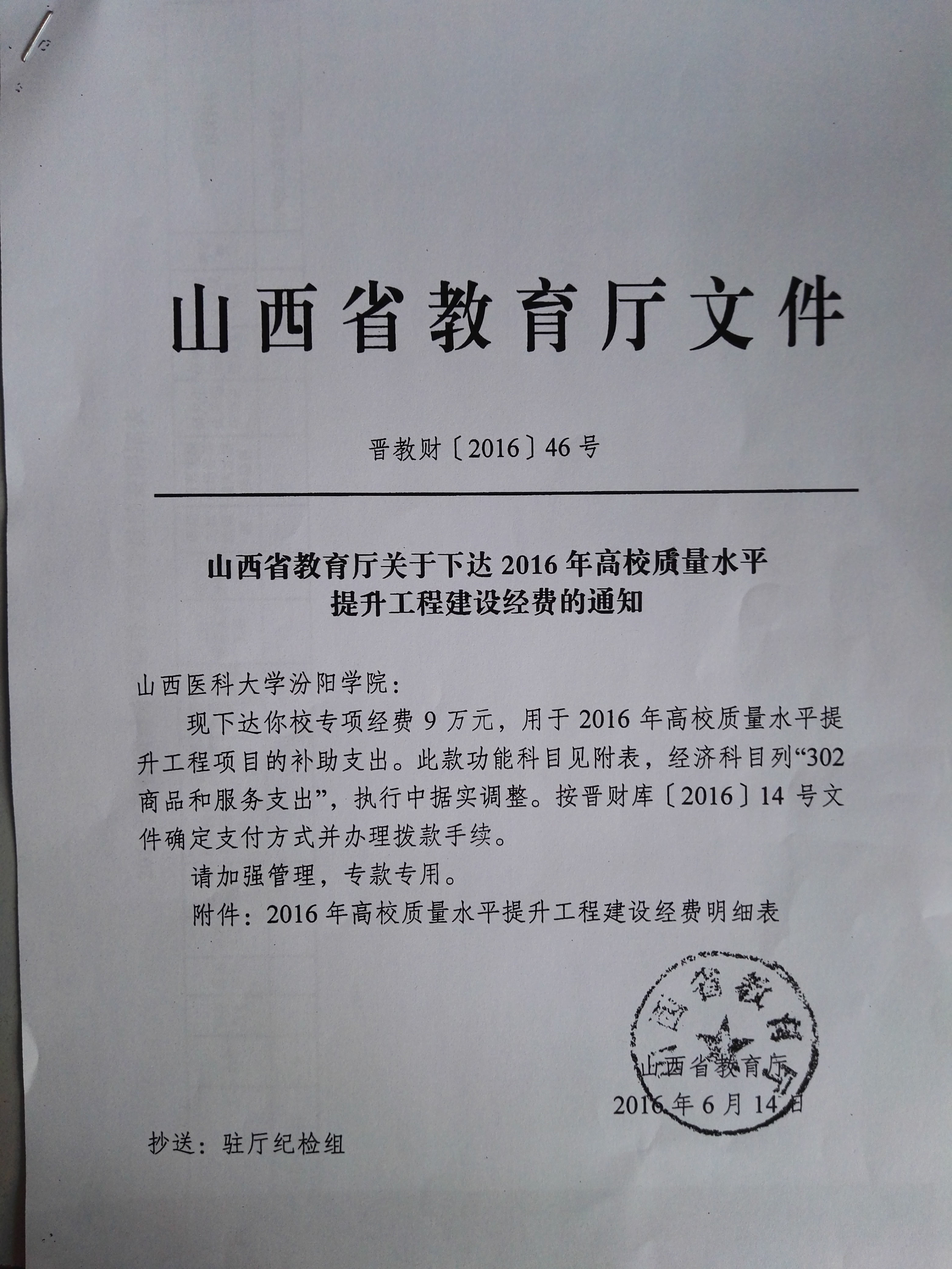 山西省教育厅关于下达2016年高校质量水平提升工程建设经费的通知