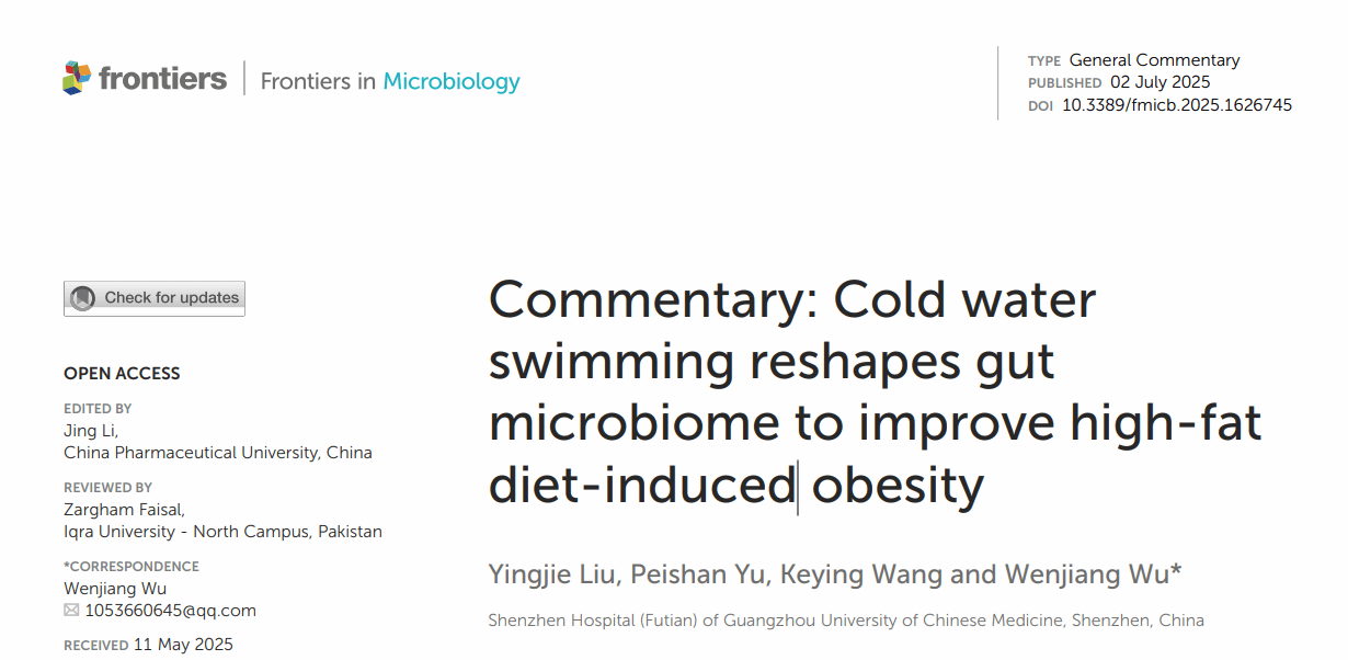近期,我校临床医学本科专业520班学生崔程龙、李昊作为共同第一作者在微生物学领域知名期刊《Frontiers in Microbiology》(中科院二区,IF:4.5)上发表的研究论文《Cold water swimming reshapes gut microbiome to improve high-fat diet-induced obesity》引起学界同行的关注,并以“评论文章”形式在同一期刊上获得专文评述与讨论。这一突破不仅体现了我校本科生扎实的科研功底与创新能力,更成为我校深化科研育人、落实立德树人根本任务的生动实践,也标志着我校本科人才培养质量迈上新台阶,彰显了我校本科毕业生优秀的科研潜力与综合竞争力,极大鼓舞了全校学子投身科学探索、扎根医学领域的热情。